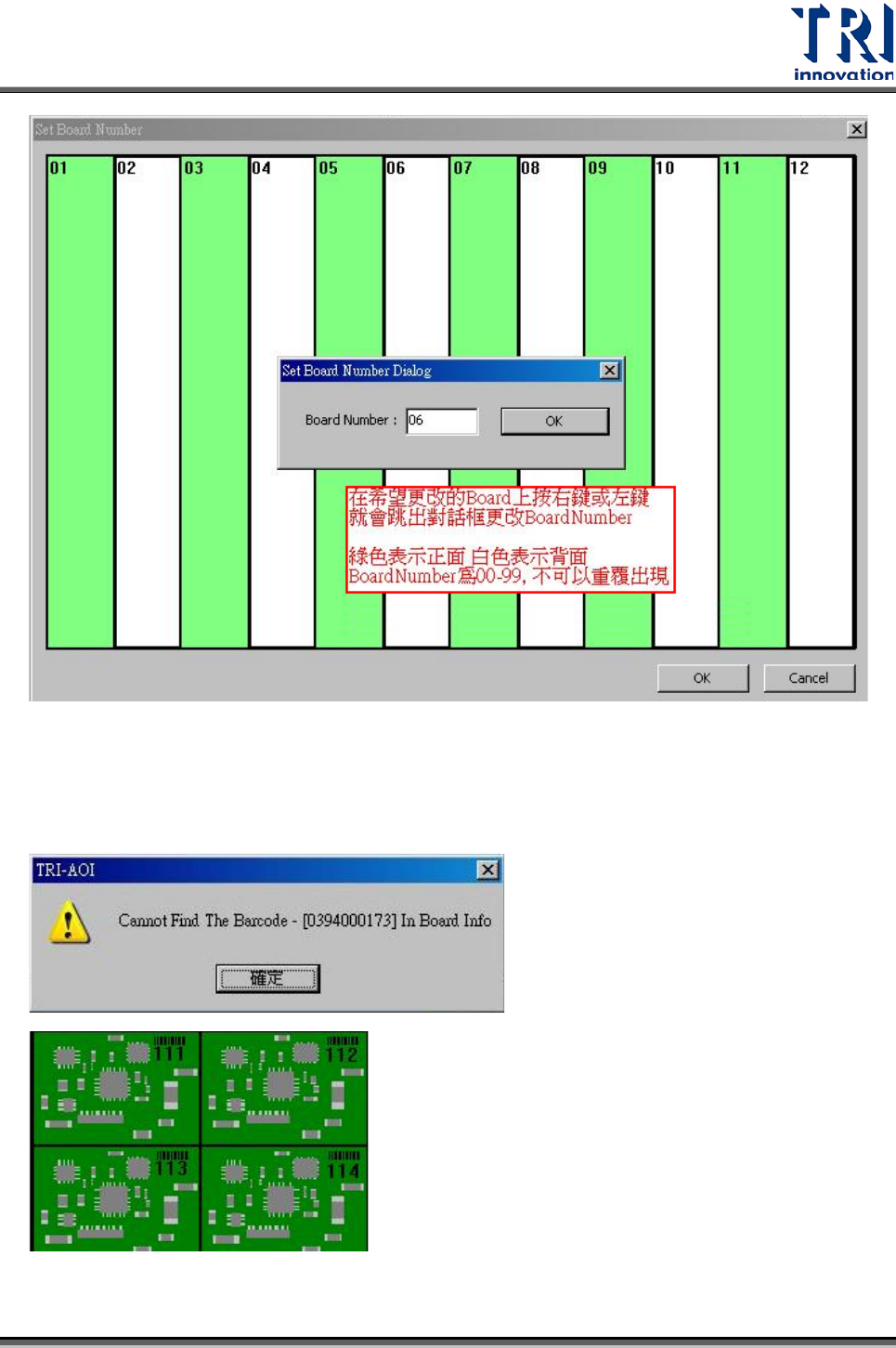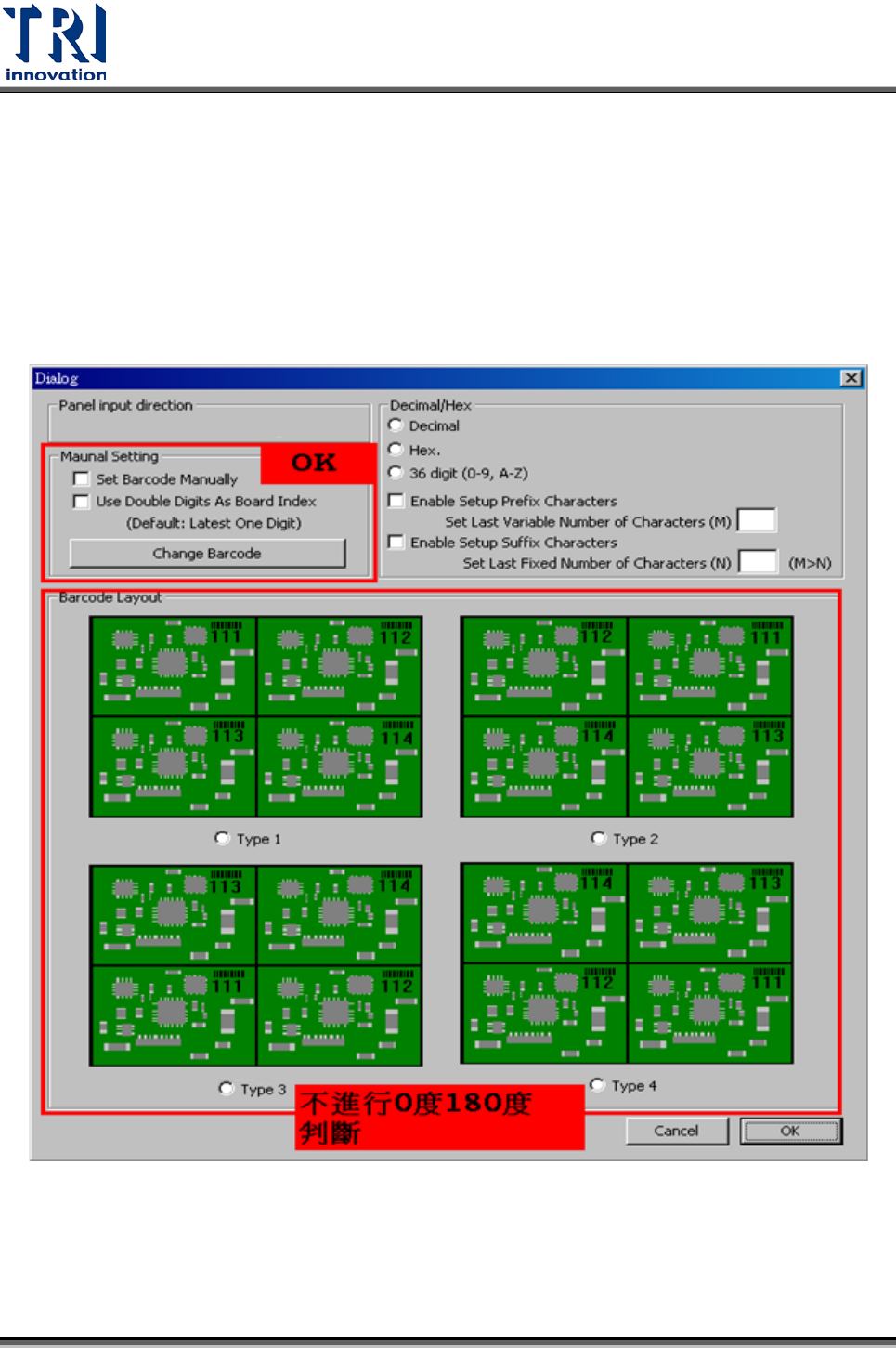 Test Research Inc. TR 7700 S II DL Us er Gui de – Software 111 如果有找到,會根據條碼的末兩碼去判定現在板子是正面還是背面, 根據正面或背 面來產生相對應的 Barcode Strings 。 條碼以一帶多功能加入,根據讀到的條碼判斷待測板擺放位置為 0 度或 180 度。 此判斷模式只會套用在以一帶多,手動鍵入條碼尾數。 Step 4. 啟動以一帶多的功能,選擇 [Mult…