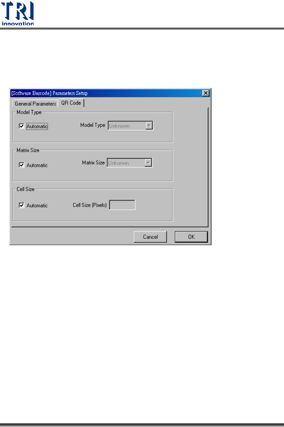 Test Research Inc. TR 7700 S II DL Us er Gui de – Software 139 條碼圖像預先定位功能 QR Code • Model Ty pe – 條碼的編碼型態。系統預設『自動偵測』。 • Matri x Size – 陣列尺寸。系統預設『自動偵測』。意義與 DataMa trix Mat rix Size 同。 • Cell Size – 陣列元素尺寸( Pixel )。系統預設『自動…