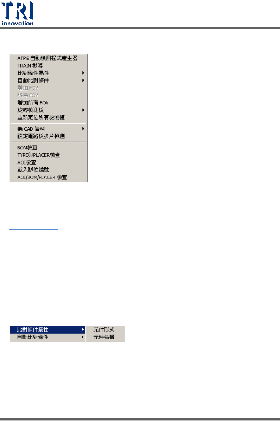 Test Research Inc. TR 7700 S II DL Us er Gui de – Software 141 3.4 程式 3.4.1 ATPG 自動檢測程式產生器 點選此功能可以進入 ATPG 自動檢測程式產生器流程視窗,詳細內容請參閱 第四章: ATPG 功能介紹 。 3.4.2 TRAIN 教導 點選此功能此按鈕可以進入教導模式。詳細內容請參閱 第五章: Train 視窗功能介紹 。 3.4.3 比對條件屬性 3.…