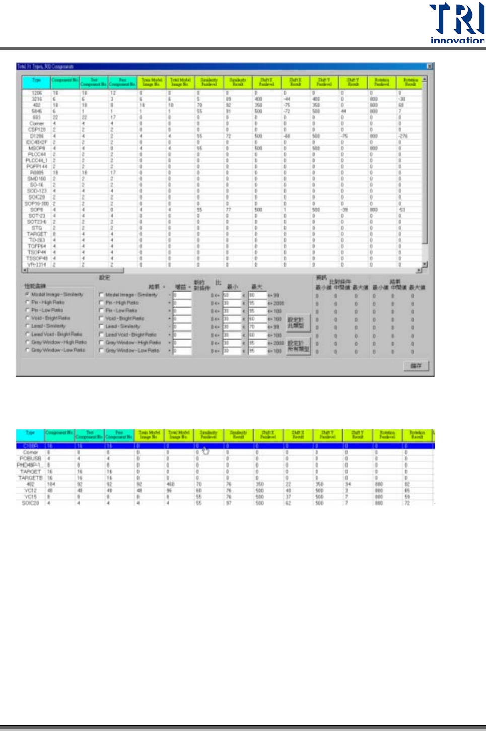 在元件形式列表中,前四欄表示元件的基本資訊,接下來分別顯示各種檢測框的資訊。
