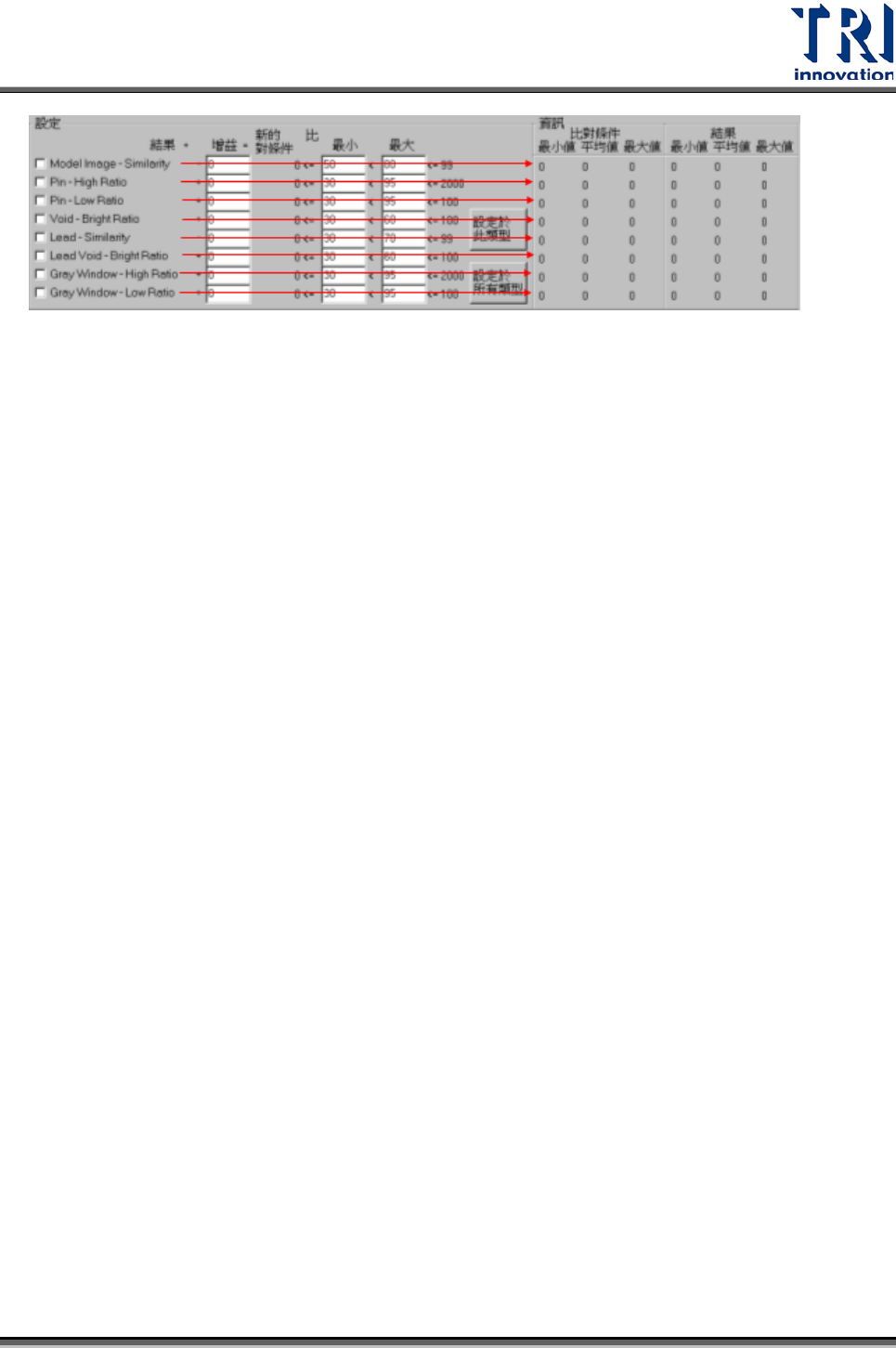 Test Research Inc. 144 TR 7700 S II DL Us er Gui de – Software 勾選所要變更的檢測框參數種類後,按 [ 設定於此類型 ] 或是 [ 設定於所有類型 ] 即可依所 設定條件變更參數。 • 勾選區:勾選的檢測參數表示要改變的參數 • 增益:可輸入對應參數要增加或減少的數值。系統會根據每顆元件平均檢測的結 果加或減這個數值,作為新的比對條件門檻值。 • 最小、最大:可給予新參數限制…