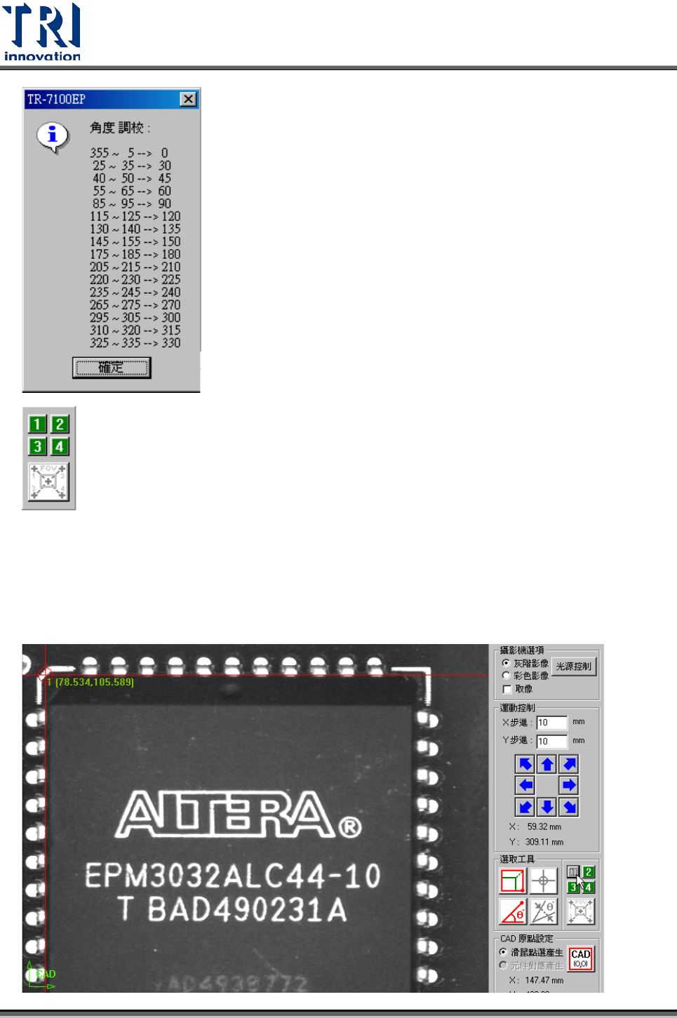 Test Research Inc. TR 7700 S II DL Us er Gui de – Software 159 大型元件工具 • 定義元件座標的工具。若元件超出一張影像的範圍,使用方塊工具沒有辦法找到 元件中心的話,可使用這一組大型元件工具來幫助我們找到元件的中心座標。 Step 1. 將十字工具移到目標元件的左上角後按下 [1] 按鈕,取得第一個角落的座標位 置。