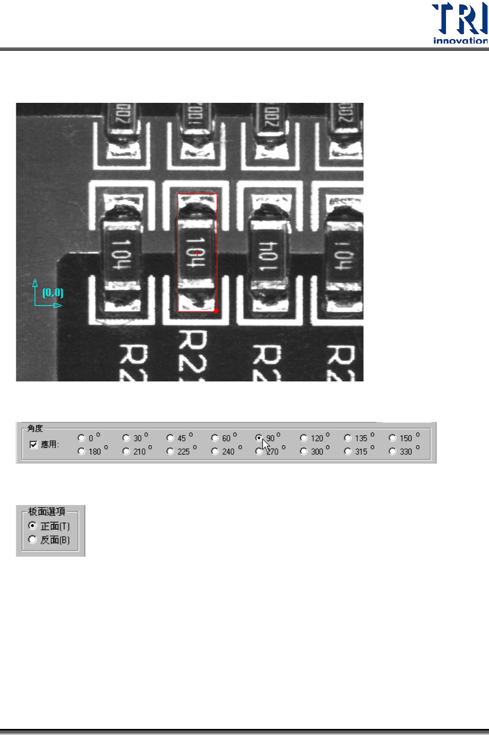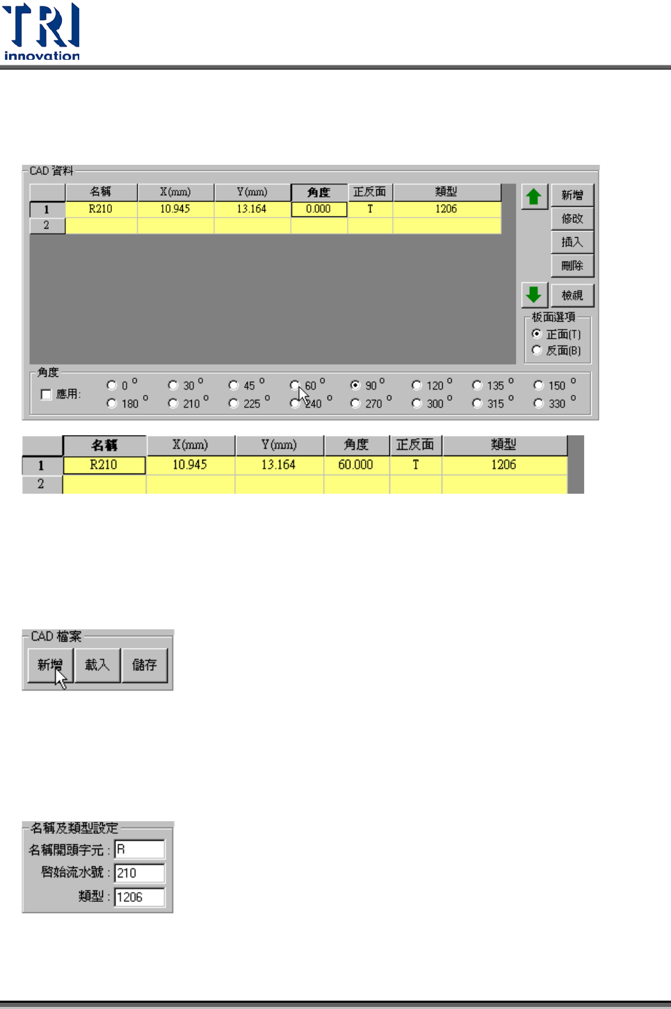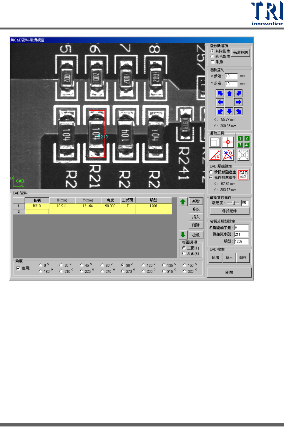 Test Research Inc. TR 7700 S II DL Us er Gui de – Software 169 或在已經存在的資料列 表中選擇欲更改的 [ 角度 ] 後,點選 [ 角度 ] 欄位中其中一個角 度值, 則角度資料及可立即被修改。 3.4.10. 4 建立新座標檔流程 Step 1. 選擇 [CAD 檔案 / 新增 ] 來開啟一個新檔。 Step 2. 使用 [ 運動控制 ] 功能或在影像中點選滑鼠右鍵來移動攝…
