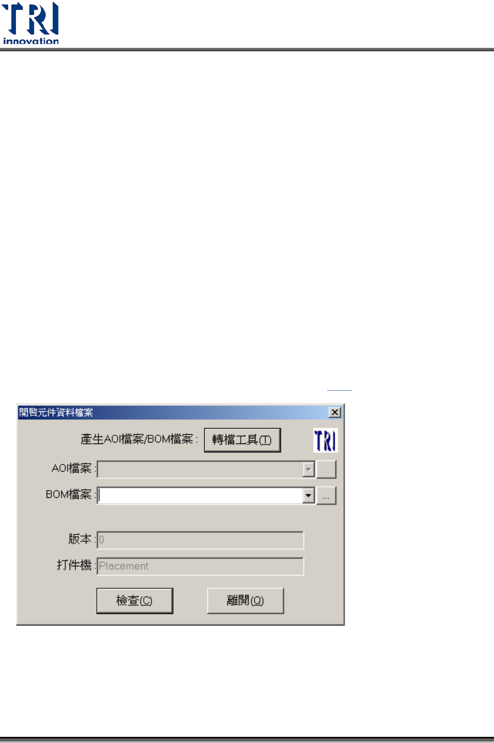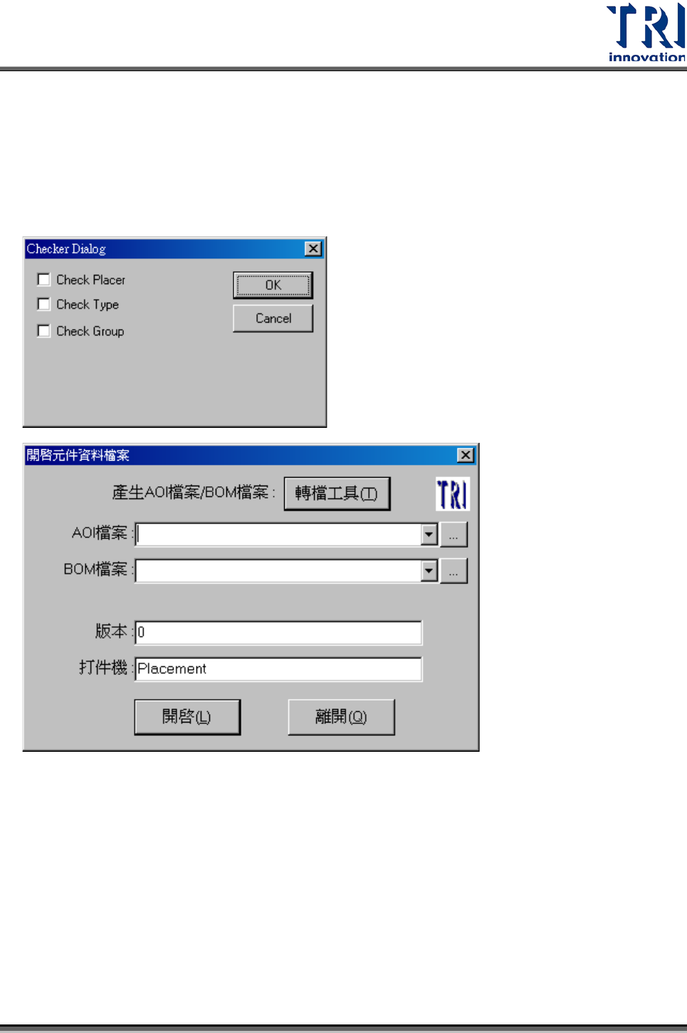 Test Research Inc. 184 TR 7700 S II DL Us er Gui de – Software 3.4.13 T YPE 與 P LACER 檢查 可選擇要進行檢查的項目後 ( 可選擇檢查打件機資訊、類型資訊或群組資組資訊 ) ,載 入一個完整包含所有欄位的 AOI 檔案,載入後 系統會比對 Pre 與載入的 AOI 檔案中的 元件資訊,只對於在 Pre 中存在的元件的資訊進行置換。 3.4.14 AOI …