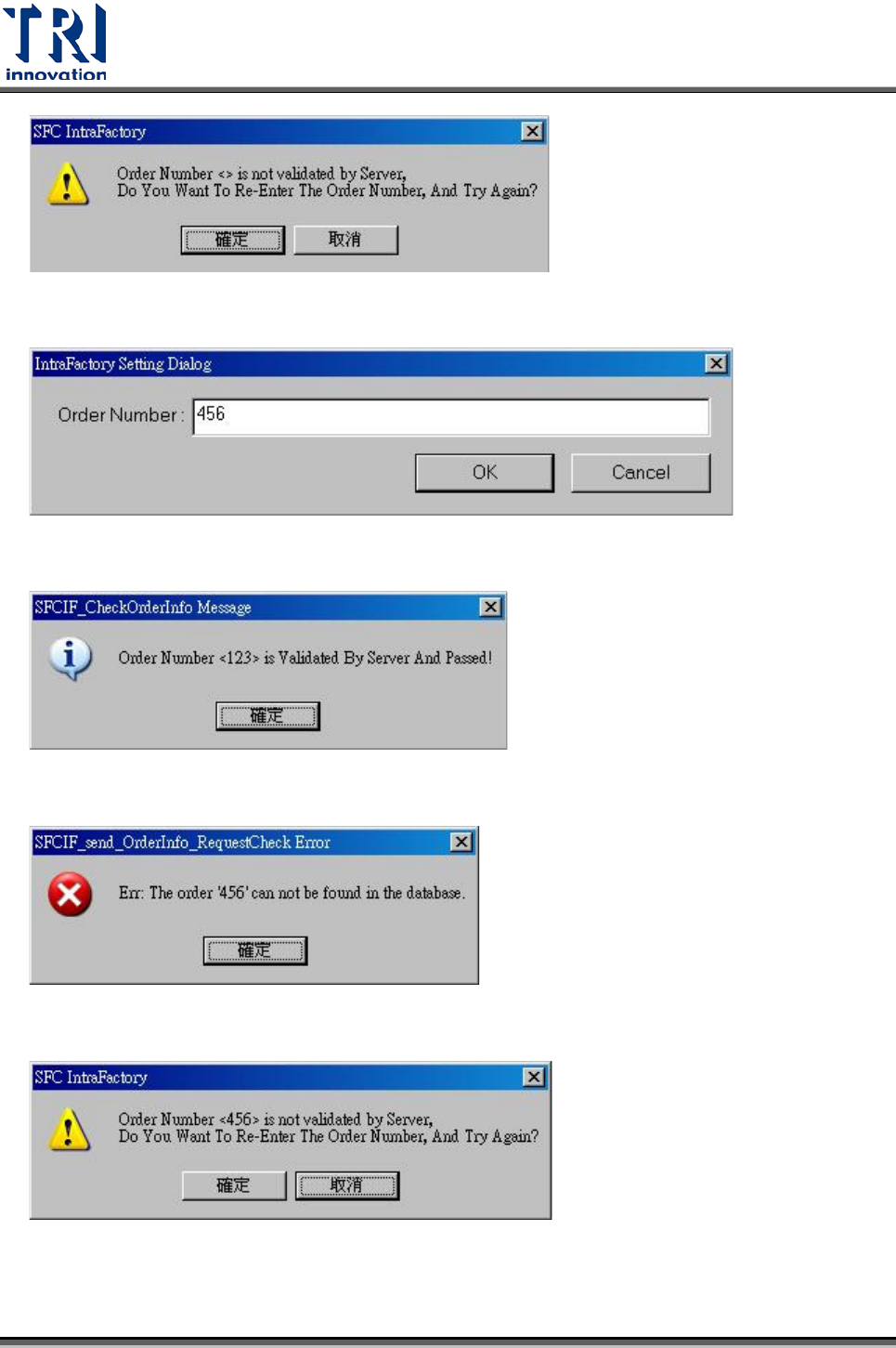 此次訂單編號如果被客戶端的 SFC System 拒絕,AOI 會顯示下列訊息。