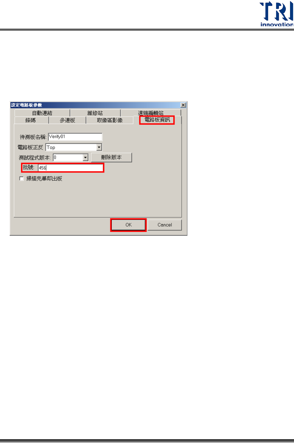 Test Research Inc. 198 TR 7700 S II DL Us er Gui de – Software 如果使用者希望修改專案檔中的訂單編號,則可選擇使用下拉選單中 [ 參數 (Parame ter)/ 電路板 (Panel)] 功能。 選擇 [ 電路板資訊 (Panel Info)] 可以針對訂單批號 (Lot Number) 進行修 改,在使用者按 下確認後, AOI 會將此訂單編號跟客戶端的 SFC Syst…