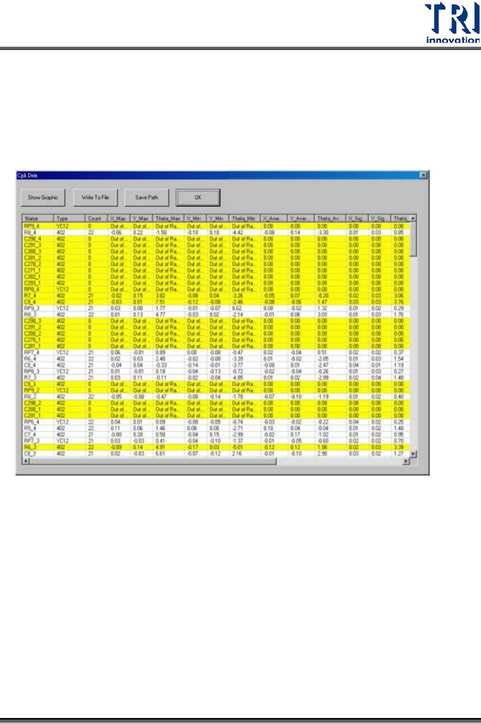 亮黃色代表結果異常(低於 CpkSpec)。