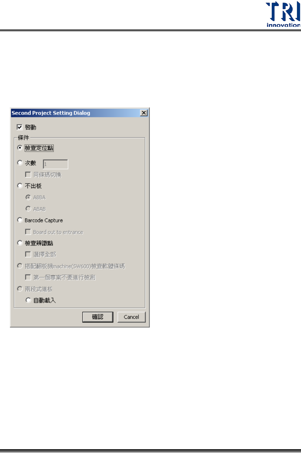 Test Research Inc. 220 TR 7700 S II DL Us er Gui de – Software 3.7.18 第二專案 可設定兩個檢測程式以特定間隔輪流檢測,或是以對位標記位置自動在兩個程式間切 換。 3.7.18. 1 第二專案設定 (Second Project Setti ng) 啟動 :將下方條件選項功能開啟。此功能開啟後,選擇開啟程式時,在載入第一個程 式後,會再次詢問是否載入第二個程式,此時請選…