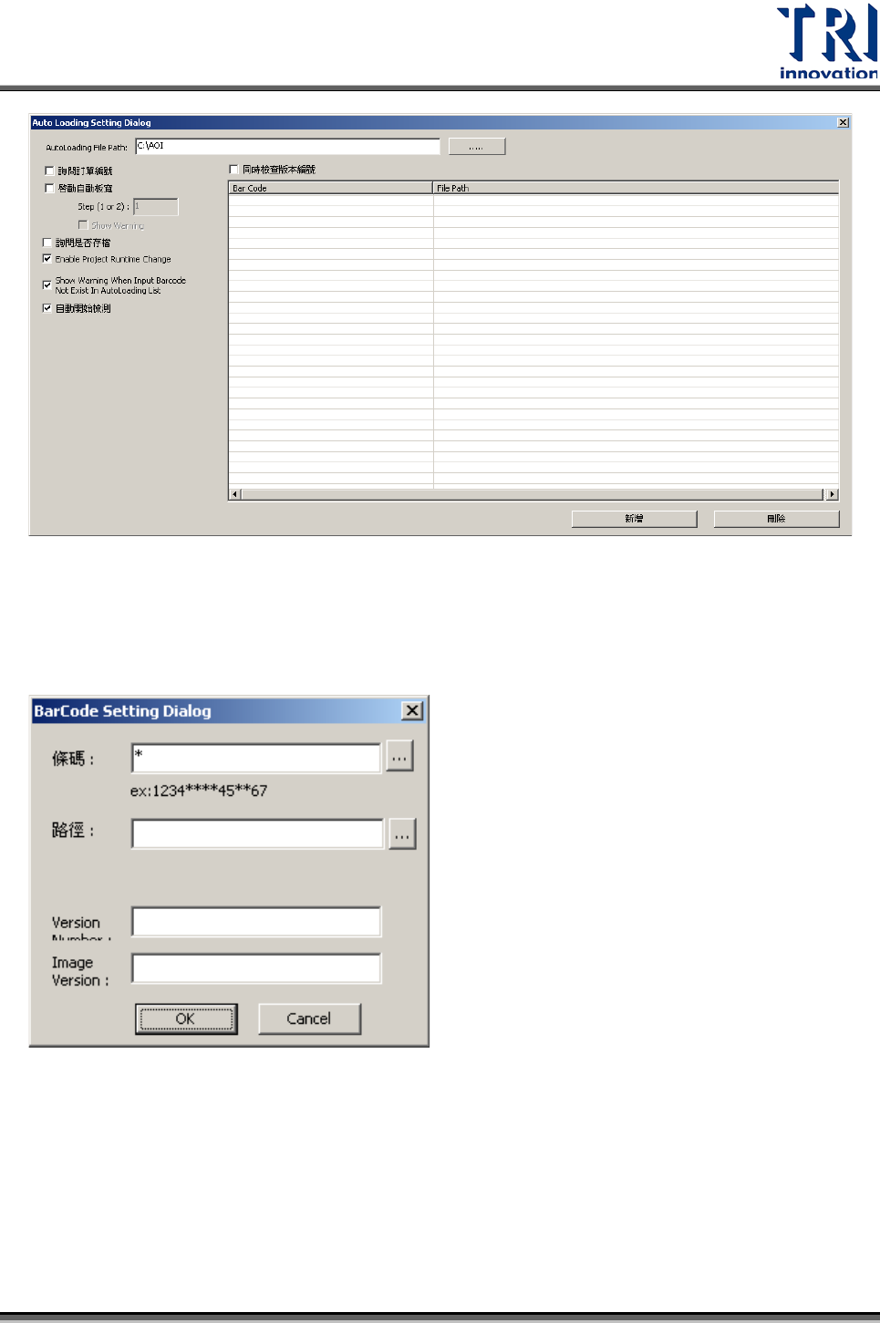 Test Research Inc. TR 7700 S II DL Us er Gui de – Software 233 Step 5. 若勾選 [ 啟動自動載入功能 ] ,則在使用 [ 開啟舊檔 ] 功能時,會出現輸入條碼視 窗,在此時輸入的條碼若有符合之前的設定,則會自動開啟相對應的程式, 若在此時輸入的條碼沒有合乎之前的設定值,則會出現以下視窗來設定新的 對應程式。 可使用 按鈕來搜尋欲開啟的檔案路徑。 • 開啟檔案時,系統會…