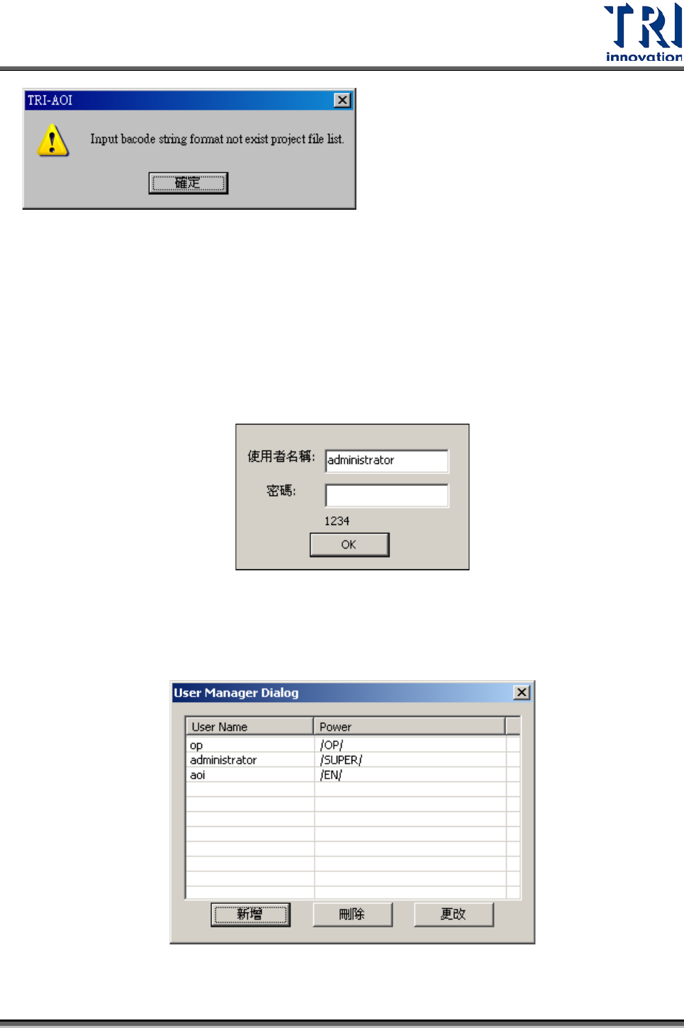 Test Research Inc. 234 TR 7700 S II DL Us er Gui de – Software 3.7.24 使用者管理 需在登錄檔新增一 DWO RD 值 [LoginFla g] 且內容設定為 [1] ,本功能才可啟用。開 啟本功能後,管理者可以將使用者的權限分級,使用者須先登入名稱及密碼才可進 入主程式。在登入、登出或是離開程式時將使用者的進入或離開時間記錄在 [C: \ WINDO WS \syst…