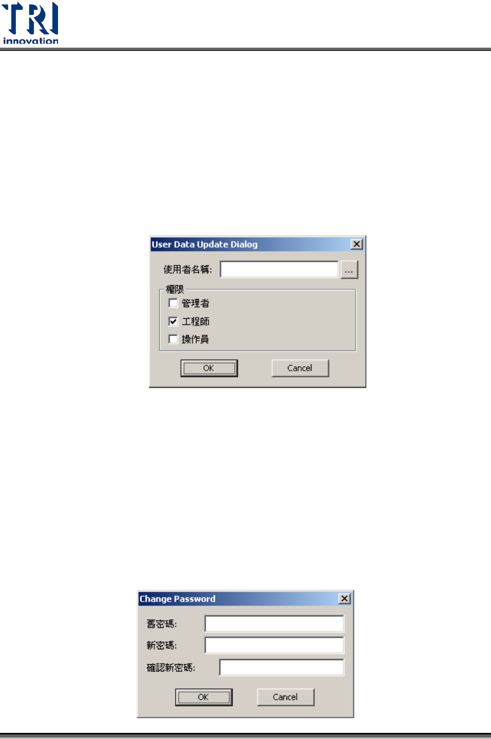 • 工程師(Engineer):能夠使用程式中除[使用者管理]外所有功能者。