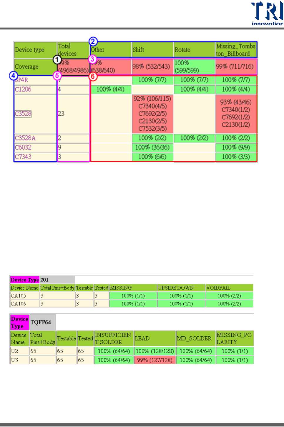Test Research Inc. TR 7700 S II DL Us er Gui de – Software 239 • 第一層總表:可以觀看各個元件類型的所有資訊。以下說明各區域表示的內容。 1. 總測試涵蓋率百分比 ( 有檢測的檢測框數 / 應有檢測框總數 ) 。 2. 列出本程式所用有缺點類型。 3. 各缺點類型的測試率 ( 該缺點類型有檢測的檢測框數 / 所有該缺點類型應有檢測 框數 ) 。若不為 100% 者以紅色顯示…