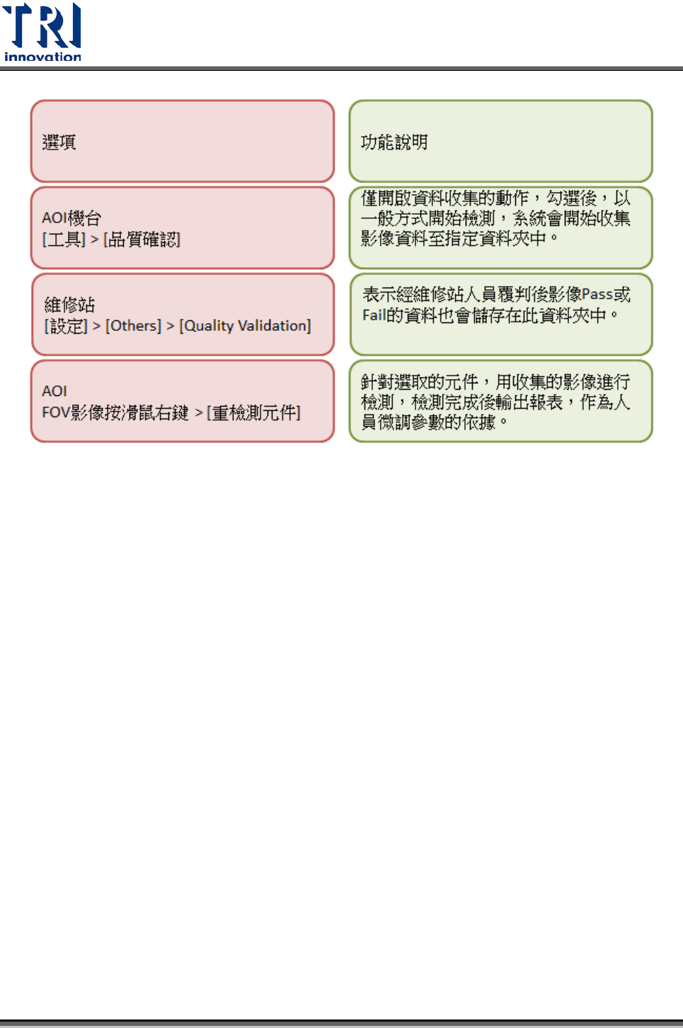 Test Research Inc. TR 7700 S II DL Us er Gui de – Software 251 Step 1. 設定 AOI 機台部份參數 : 選擇 [ 參數 ]>[ 使用者模式 ]>[ 連結維修站 ] 。 勾選 [ 工具 ]>[ 品質確認 ]>[ 啟動 ] 。 選擇 [ 工具 ]>[ 品質確認 ]>[ 設定 ] ,並指定不良影像資料夾路徑。 Step 2. 設定維修站電…