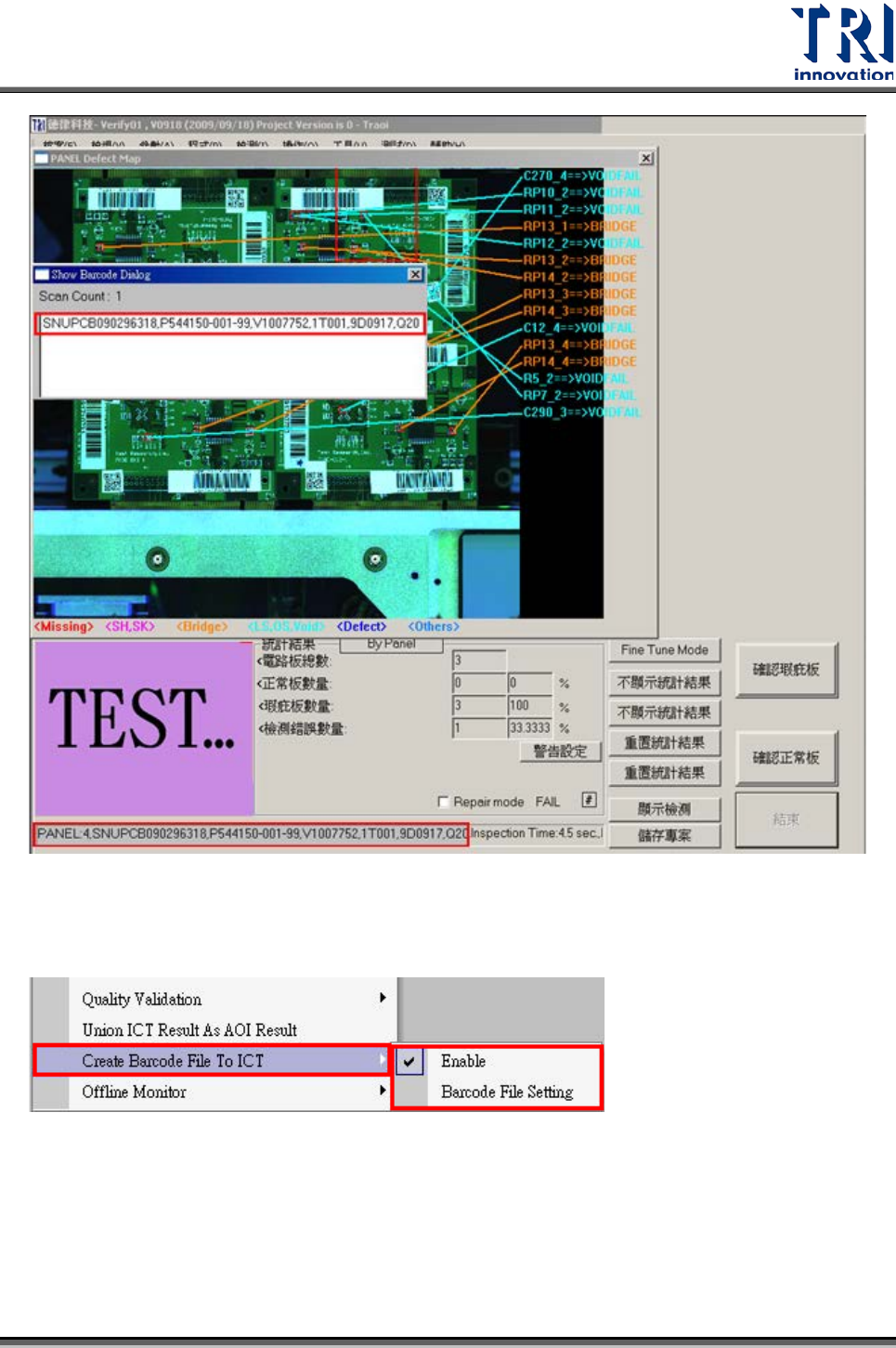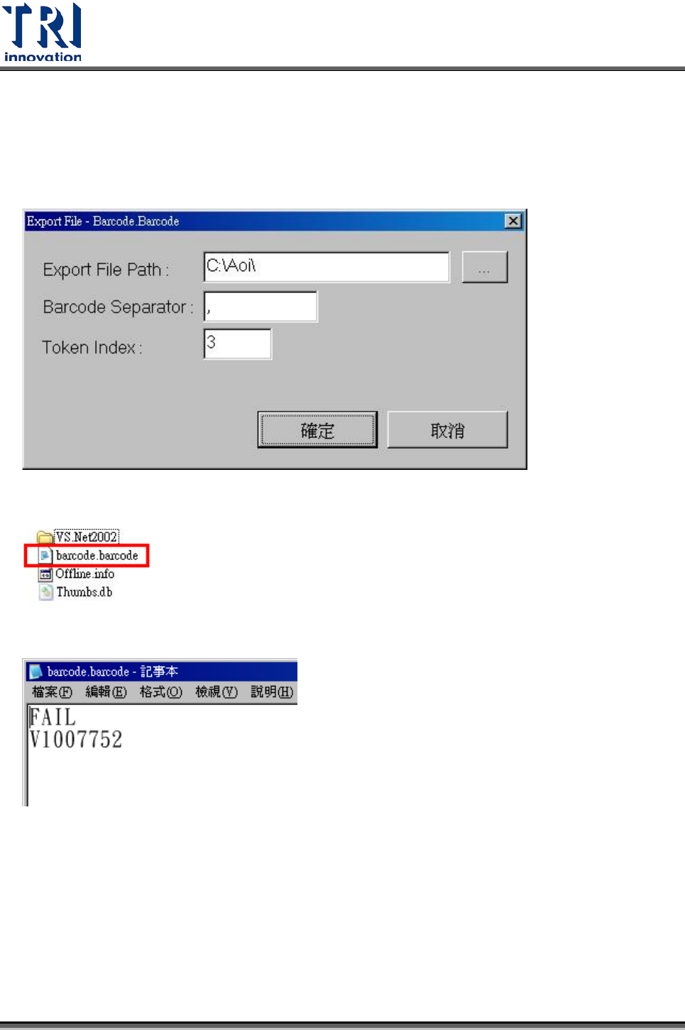 Test Research Inc. TR 7700 S II DL Us er Gui de – Software 259 存放位置預設值為 [ C: \ AOI ] 條碼的分割字元,預設值為 [,]( 逗號 ) 。 選擇的條碼索引,預設值為 1 。 [b arcode.b arcode ] 檔案 會在檢測完成後產生。 資料內容如下 TRAOI 版本 : Ver 3. 8 以後的版本 AOI 機台傳送檔案可讓 [Spea …