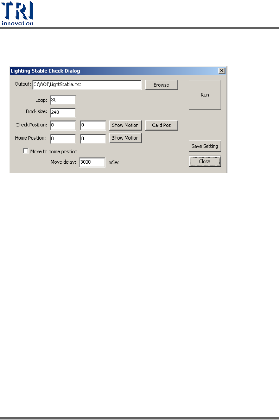 Test Research Inc. TR 7700 S II DL Us er Gui de – Software 281 3.8.6 光源穩定測試 可輸出指定區塊範圍內的平均灰階值。 參數說明如下: Output :報表輸出檔案名稱。 Loop :測試次數。 Block size :測試區塊的大小 ( 單位 pixel ) 。 Check Posi tion :灰卡的位置。 - Show Moti on :開啟 motion 工具可…