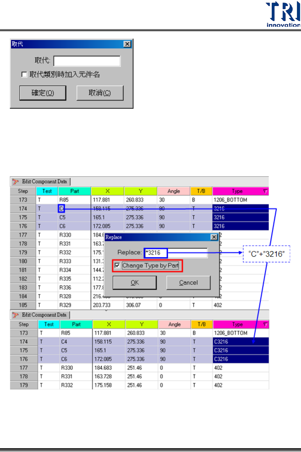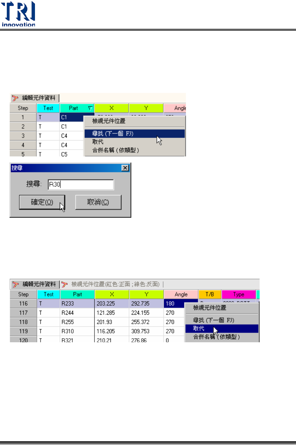 Test Research Inc. TR 7700 S II DL Us er Gui de – Software 297 4.2.2 尋找 ( 下一個 F3 ) 在視窗中輸入關鍵字即可在元件資料表的所有欄位中找尋資料,要以相同條件尋找下 一個請按 F3 。 4.2.3 取代 可使用此功能來修改除了 [Test] 、 [Part] 、 [T/B] 及 [Board NO.] 欄位外的資料 在欲修改資料的欄位上按一下滑鼠右鍵,選則 [ …
