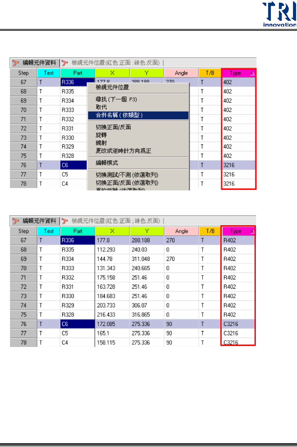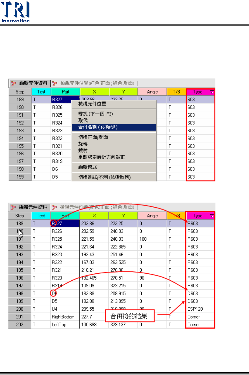 Test Research Inc. 300 TR 7700 S II DL Us er Gui de – Software 也可以按住 “Ctrl” 來多選元件後進行合併