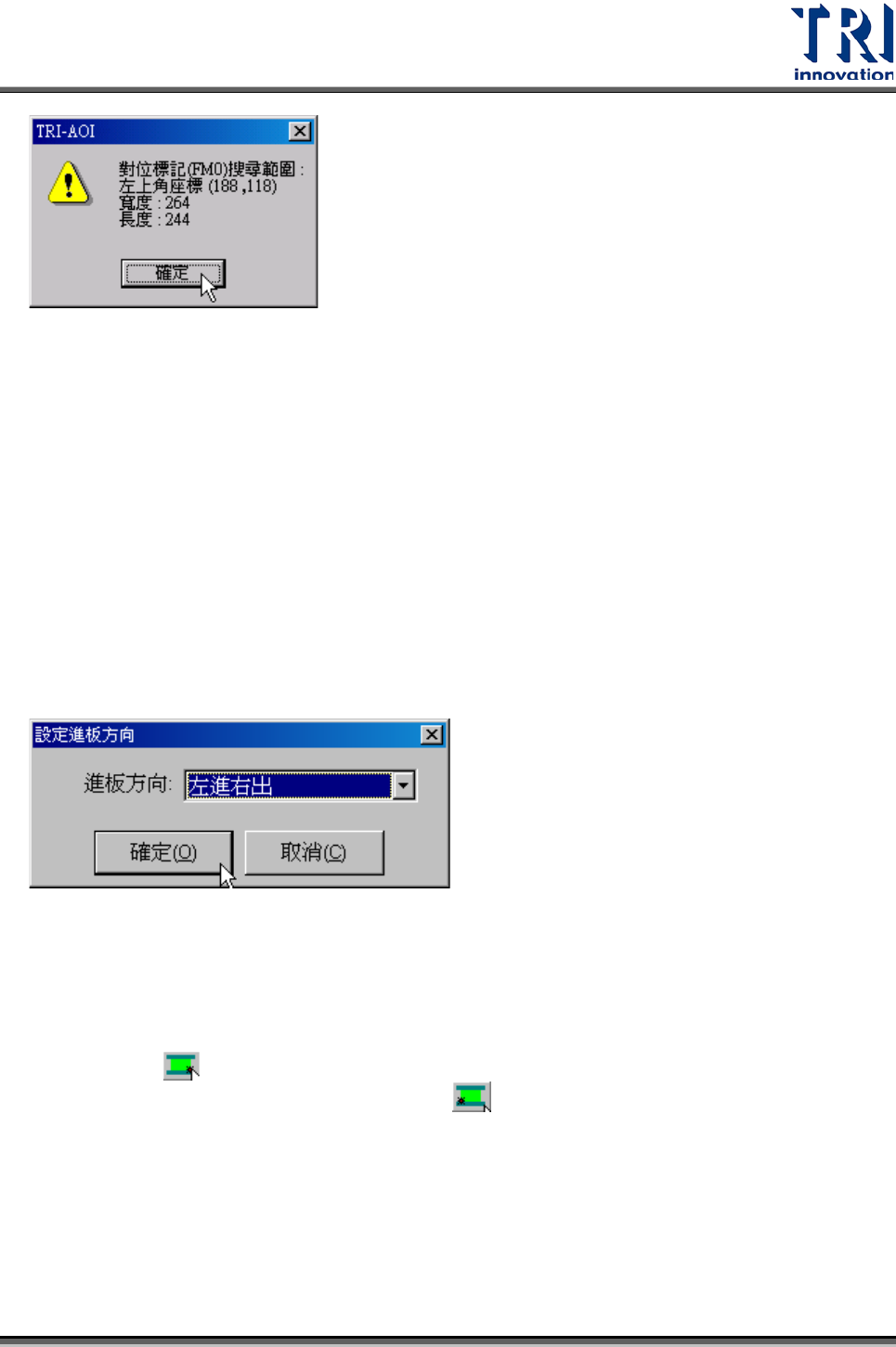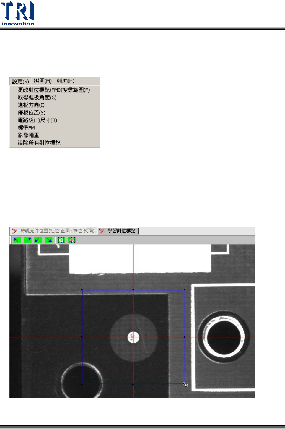 Test Research Inc. TR 7700 S II DL Us er Gui de – Software 319 4.4 學習對位 標記 4.4.1 設定 4.4.1.1 更改對位標記 (FM0) 搜 尋範圍 此功能可以手動設定第一對位標記的搜尋範圍,不設定代表使用系統預設值。先使用 滑鼠將藍色萬用方塊調整至與設定搜尋的位置及範圍,接著按下此按鈕,會出現搜尋 範圍的位置及大小視窗,確認無誤後請按 [ 確定 ] 即可。