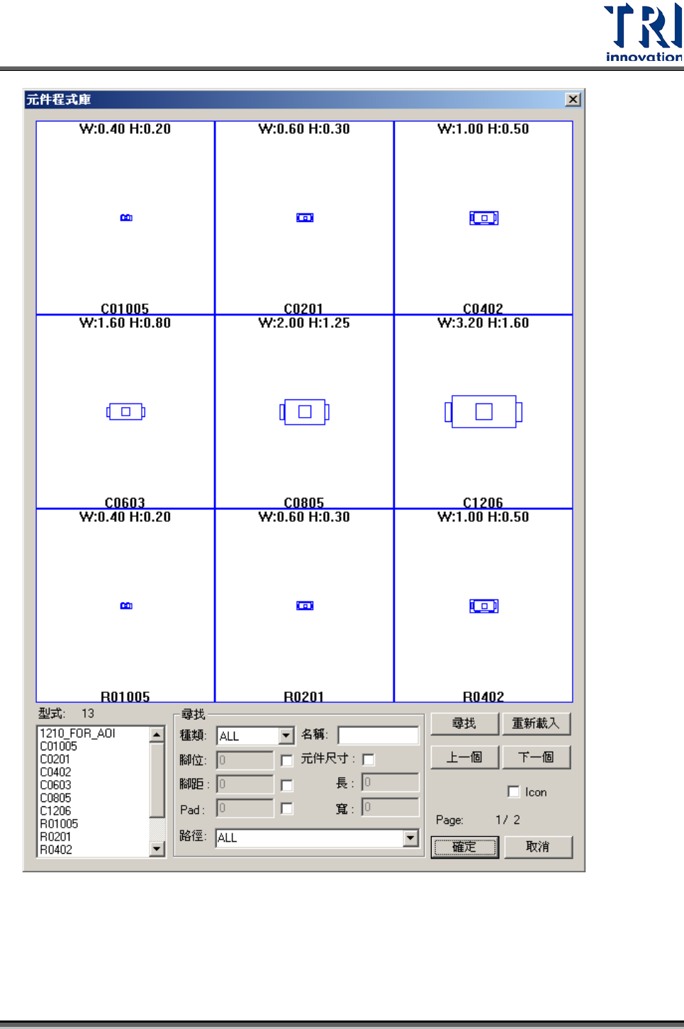 :輸入條件後按下[尋找]按鈕,可找出所需的元件資料庫。