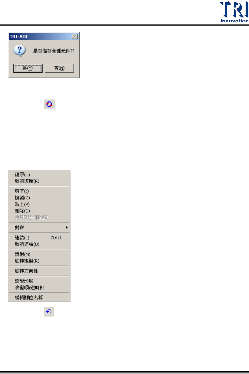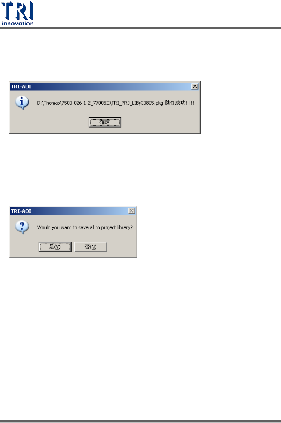 Test Research Inc. TR 7700 S II DL Us er Gui de – Software 341 4.9.2.4 存至程式元件庫 把現在這個 Library 存成本機種專用的 Library ,儲存的路徑在和 Project 同目錄下的 TRI_PRJ_LIB 資料夾 。 4.9.2.5 全存到 p rj lib 把這個程式中所有的 Library 存成 Project Li brary ,儲存的路徑在和 P…