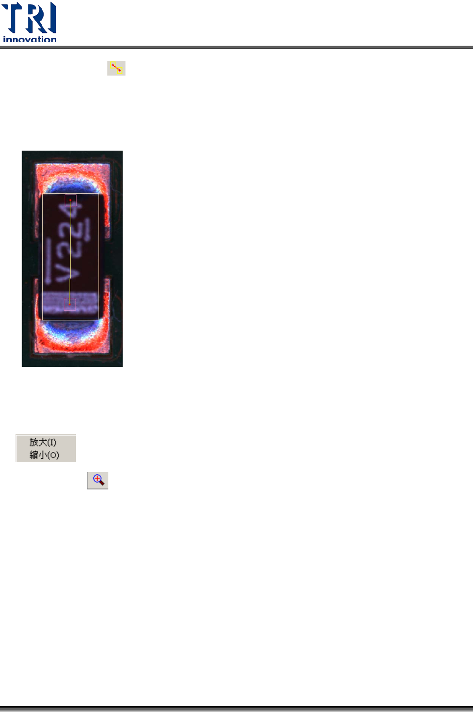 Test Research Inc. TR 7700 S II DL Us er Gui de – Software 355 4.9.5.6 反向配對 按下此按鈕會產生以兩個框為一組的檢測框,需調整其位置位於灰階值有差距的位置 上。在檢測時若發現原本兩個檢測框的灰階值相反時則可以檢測出元件極反。目前此 框功能已經被 [Missing_ Polarity] 及 [Voi d] 框取代。 4.9.6 縮放 4.9.6.1 放大 按下此按鈕後…