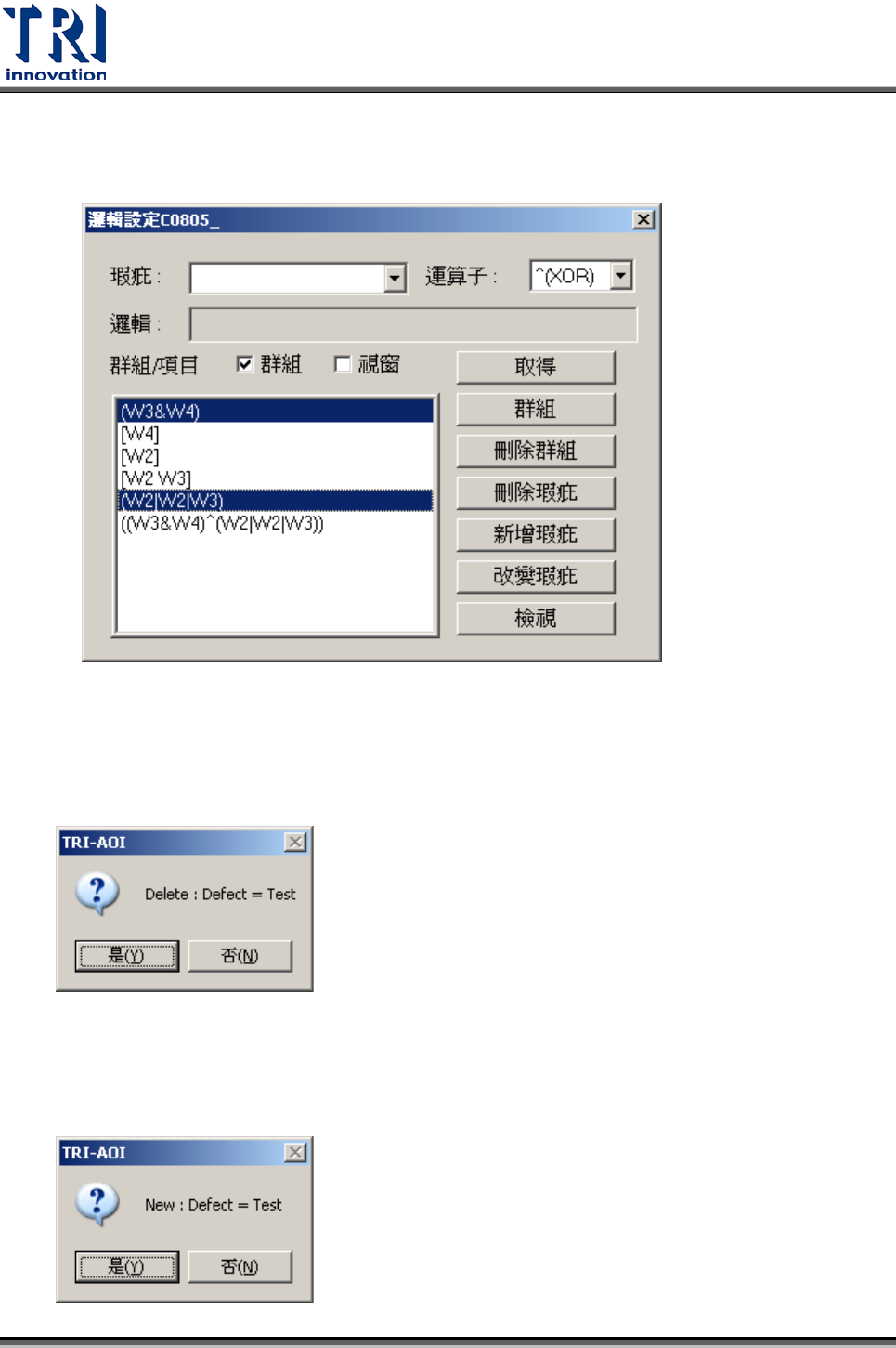 Test Research Inc. 382 TR 7700 S II DL Us er Gui de – Software • 若設定邏輯的檢測框是位於 IC 腳上的檢測框,則系統會詢問是否要將邏輯複製 到其他 IC 腳上相對應的檢測框上,若有需要請按 [ 是 ] ,系統將會出現視窗告知複 製了多少個邏輯,請按 [ 確定 ] 。 改變瑕疵 :可以改變瑕疵的邏輯或名稱。選取一瑕疵並編輯欲修改的部分 ( 瑕疵名稱或 邏輯方程式 ) ,接著…