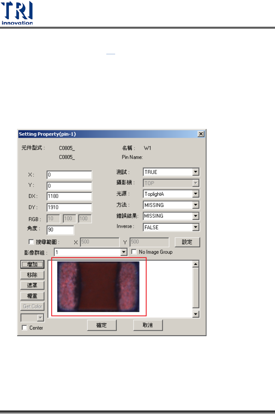 Test Research Inc. 384 TR 7700 S II DL Us er Gui de – Software 設定則在 X 及 Y 欄位 中顯示 0 ,且在轉入主程式後系統會以預設值自動設定搜尋範圍。 設定搜尋範圍的方式如下: Step 1. 打開屬性視窗並勾選 [ 搜尋範圍 ] ,在影像編 輯視窗上會出現紫紅色粗實線方框, 而現今元件的搜尋範圍將以淡粉紅色系線框表示,如下圖所示。 Step 2. 點選欲設定搜尋範圍的檢…