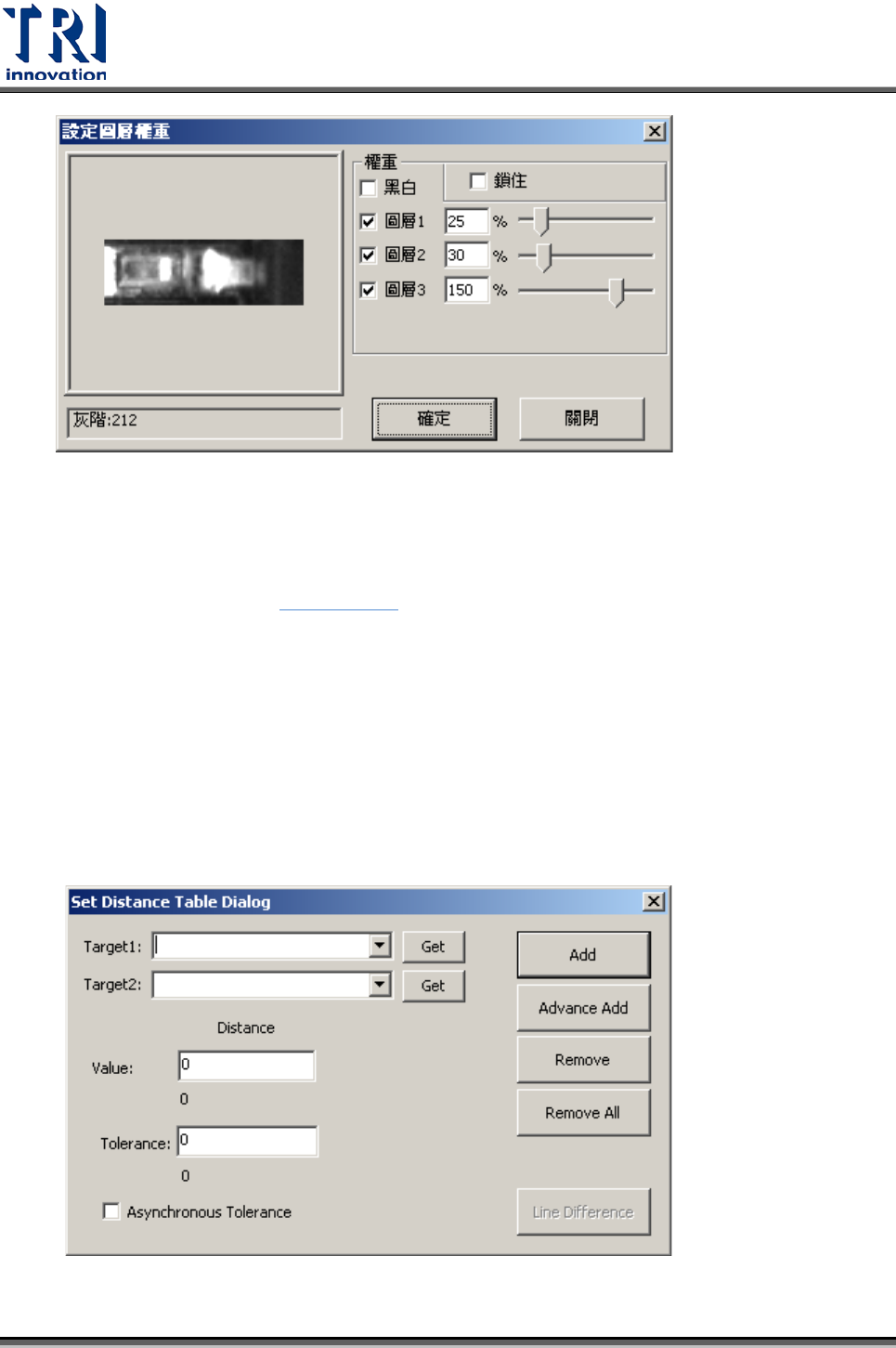Test Research Inc. 392 TR 7700 S II DL Us er Gui de – Software 另外,在屬性視窗可以看到選擇的檢測框所代表的 IC 腳號碼。 (p in - 1) 表示該檢測框不 為任何一支 IC 腳之檢測框。 4.9.8.8 權重 設定檢測框的權重。圖層 1 、 2 、 3 分別代表 R, G, B 三種色彩。 當選擇的檢測框沒有已經在屬性視窗中抓取的影像時,在權重設定視窗中會顯示出該 檢…