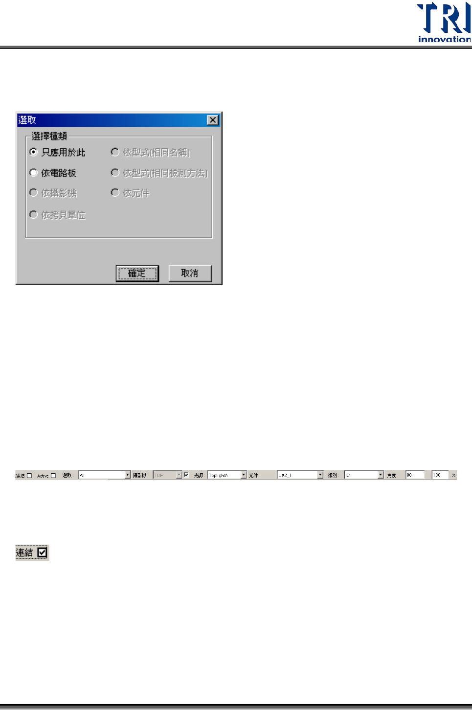 Test Research Inc. 398 TR 7700 S II DL Us er Gui de – Software • 設定可選擇是否 [By Boar d] 或 [By Type] ([Targ et1] 和 [Tar get2] 為同元件之檢測 框才可使用 ) 設定。 檢測結果的顯示 • 檢測結果在 Re sult Tree 以 [T arget1] 作為顯示 的元件名稱。 • 並將檢測結果存在 [*.pfl] 檔內傳至 …