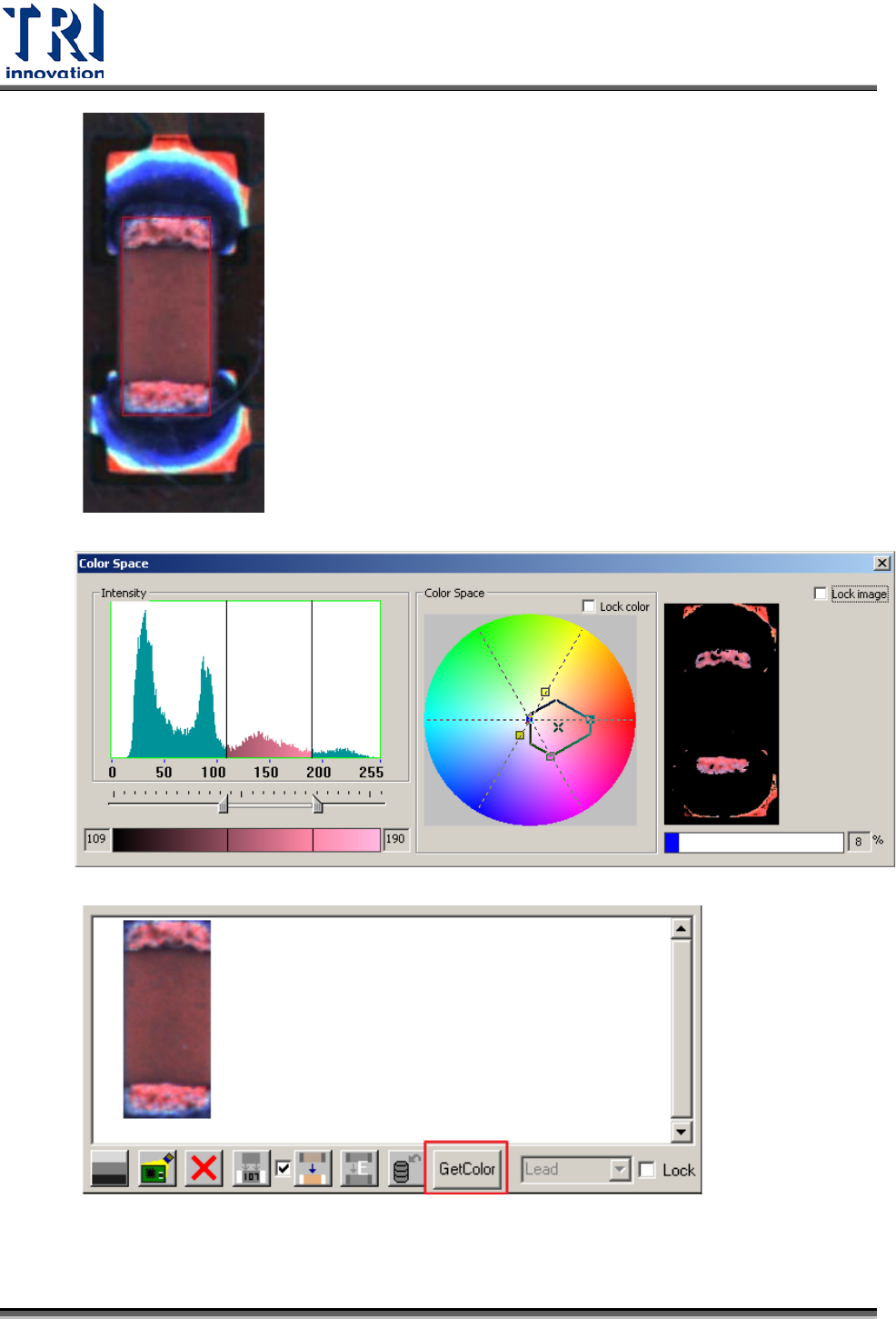 Test Research Inc. 460 TR 7700 S II DL Us er Gui de – Software 4.10.2. 25 Pad 框 根據 Pad 的顏色與色 彩空間 (Color Space) 的方式來檢測 Chip 元件的位置,主要是用 來定位其他有影像的檢測框例如 [ Missing] 、 [Lead ] 和 [Chip ] 框 ( 使用連結功能 ) 。 Color Space 的操作請參閱 5.5.10…