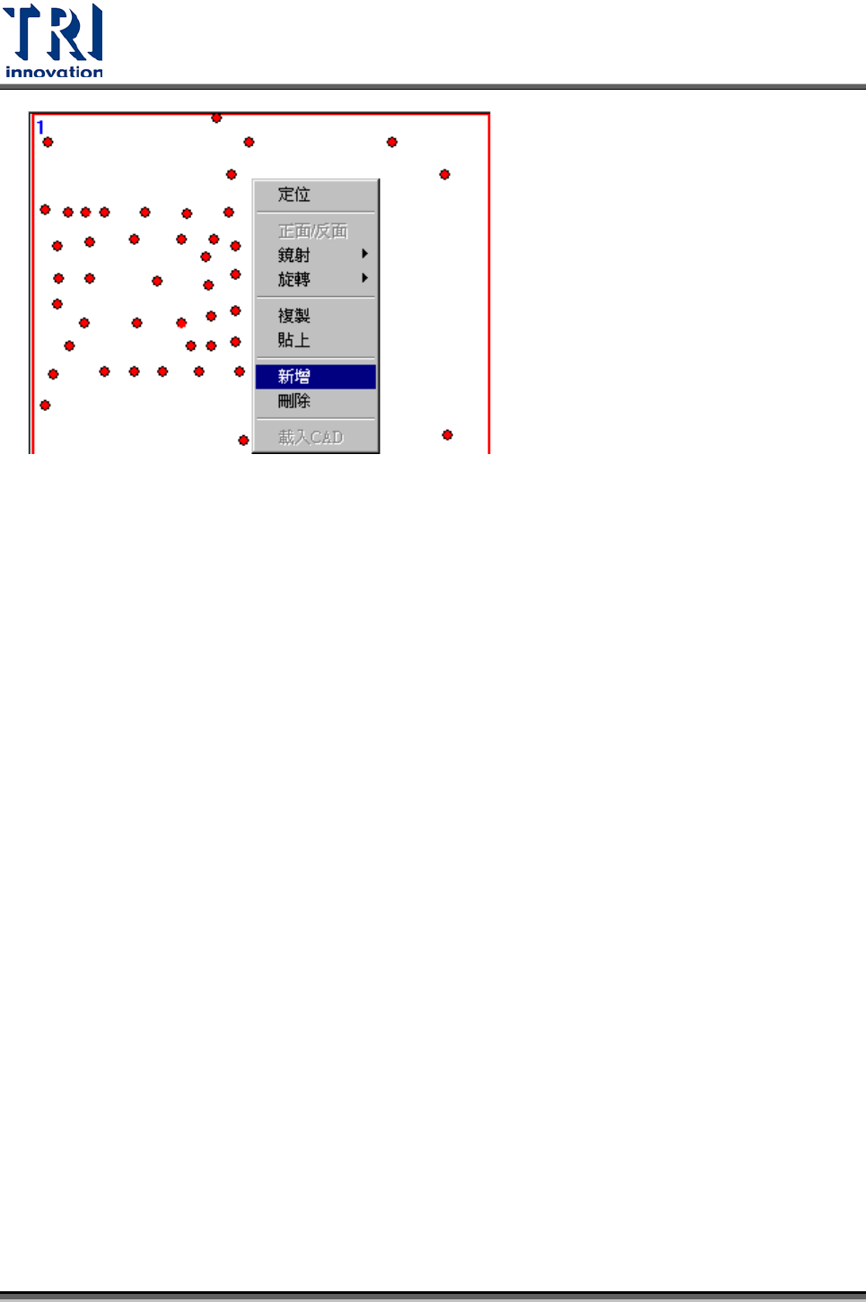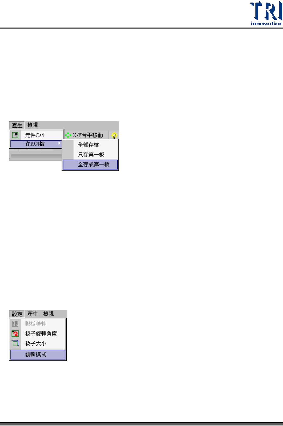 Test Research Inc. 470 TR 7700 S II DL Us er Gui de – Software 在 1 號板以外的板子選擇 [Loa d CAD] ,將其他 CA D 載入。 以 1 號板為基準完成計算旋轉角度。 對 1 號板以外的板子進行 [ 定位 (Loc ate)] 動作。 將定位完成後的 CAD 檔案輸出為 AOI 檔案。選擇 [ 產生 (Genera te)/ 全存成第一板 (Mer ge to …