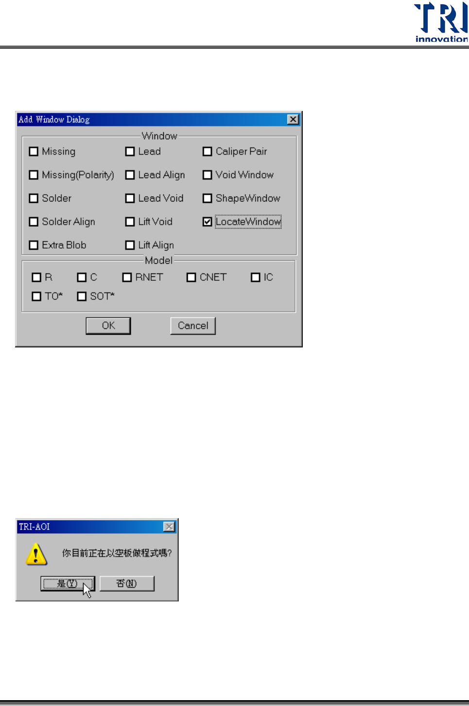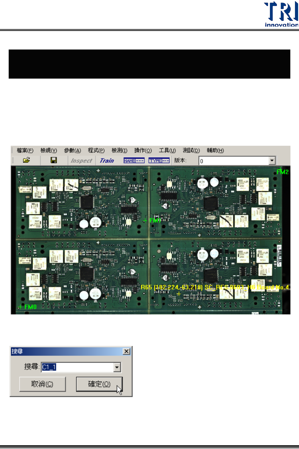 Test Research Inc. TR 7700 S II DL Us er Gui de – Software 475 系統會打 [Rightlig htA] 來進行 FOV 取像。 Step 6. 再次定位 (Reloc ate) :系統會以 [Loca te W indow] 的影像來定位相同元件的檢 測框。 Step 7. 再次擷取 FOV 影像:系統會以原本的燈光再擷取一次 FOV 影像。 Step 8. 開啟 [Trai…