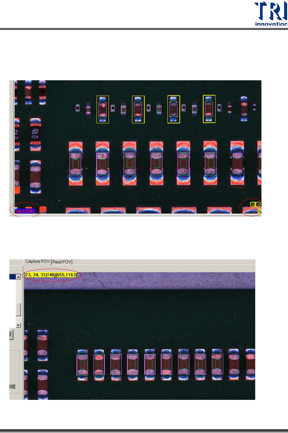 Test Research Inc. 480 TR 7700 S II DL Us er Gui de – Software 在本區域影像之中上方會顯示當時所點選的元件的群組 (Group) 。若所點選的元件沒有 分群,則影像的右下角就不會顯示文字。在本區點選任何一個檢測框後,該 FOV 左下 角會顯示此檢測框的 Fail S tring 而右下角顯示 教導狀態。 若在功能表區勾選 [ 顯示 RGB] ,在該 FOV 右上角會顯示滑鼠所…
