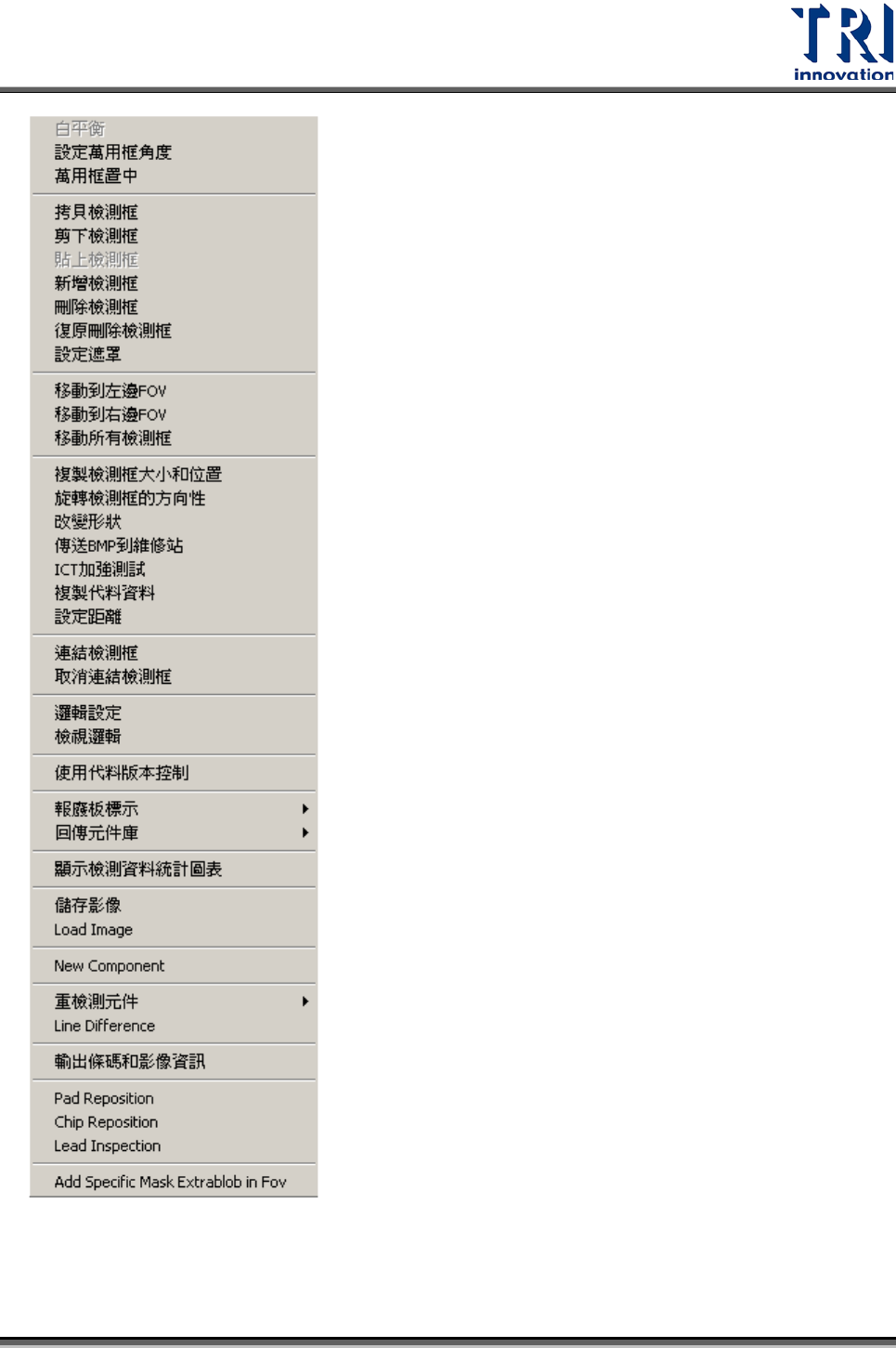 Test Research Inc. TR 7700 S II DL Us er Gui de – Software 481 已儲存 FOV 的功能表 在 FOV 區域內按下滑鼠右鍵會出現功能列表