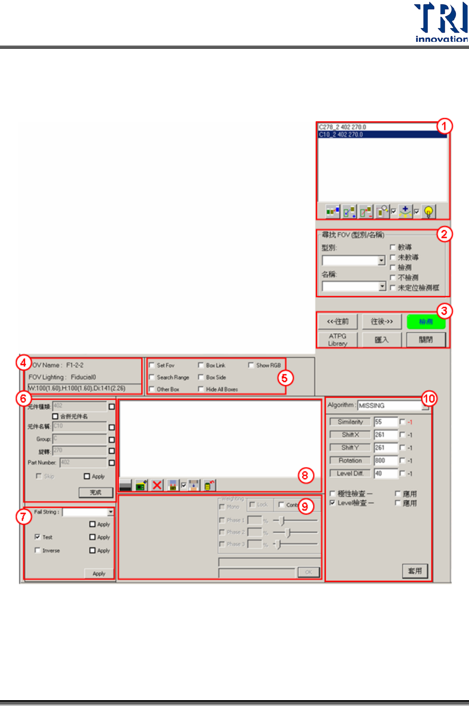 Test Research Inc. 506 TR 7700 S II DL Us er Gui de – Software 5.5 功能表區 5.5.1 功能視窗區域圖示 點選功能視窗後按下鍵盤上 [F1] 鍵,可以切換按鈕文字,使之顯示出每一個按鈕所對 應的鍵盤快速鍵。在按一次 [F1] 可將畫面切換回原來的畫面。