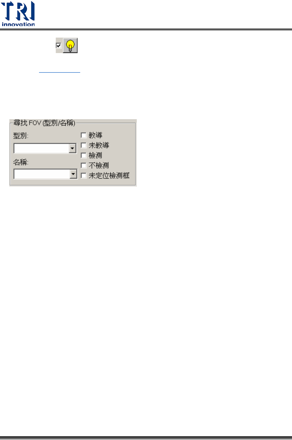 Test Research Inc. TR 7700 S II DL Us er Gui de – Software 513 7. 光源設定 請參閱 4.8 光源設定 。 5.5.3 FOV 尋找區 1. 型別 (Type) 輸入或以下拉式選單選擇型別作為搜尋條件。 2. 名稱 (Name) 輸入或以下拉式選單選擇元件名稱作為搜尋條件。 3. 教導 (Trai ned) 勾選表示以教導過的檢測框作為搜尋條件。 4. 未教導 (UnTr …