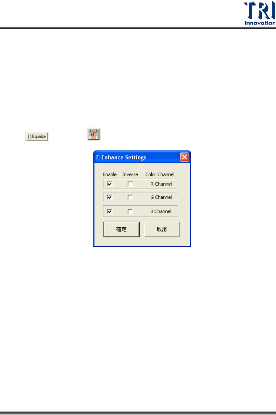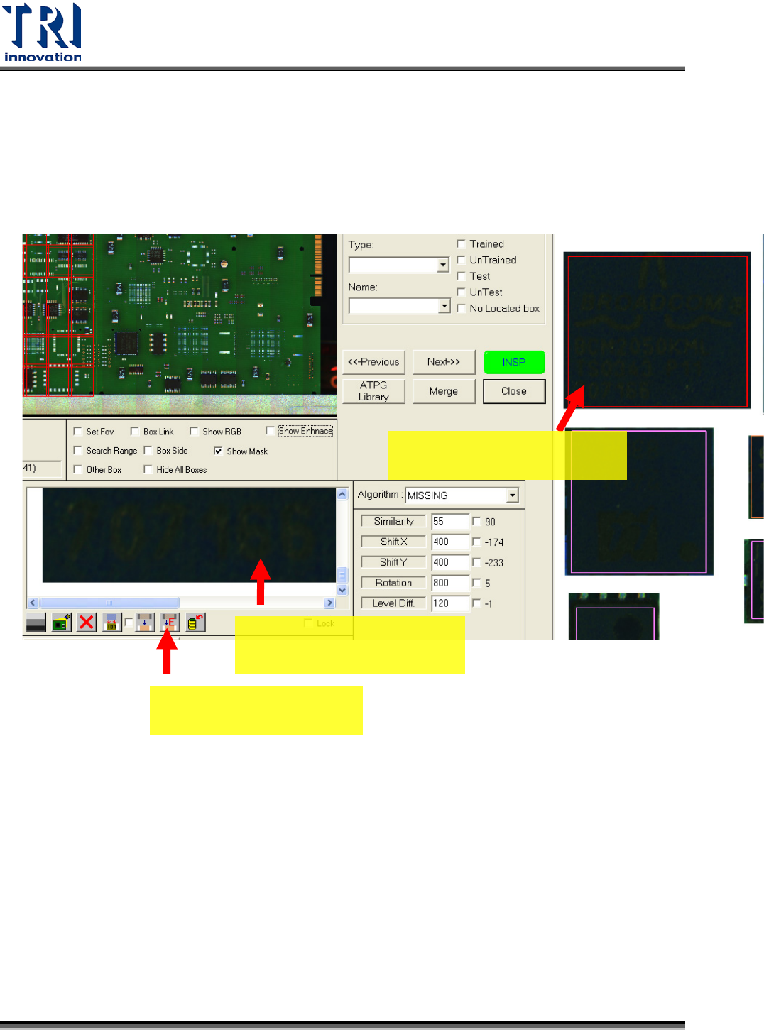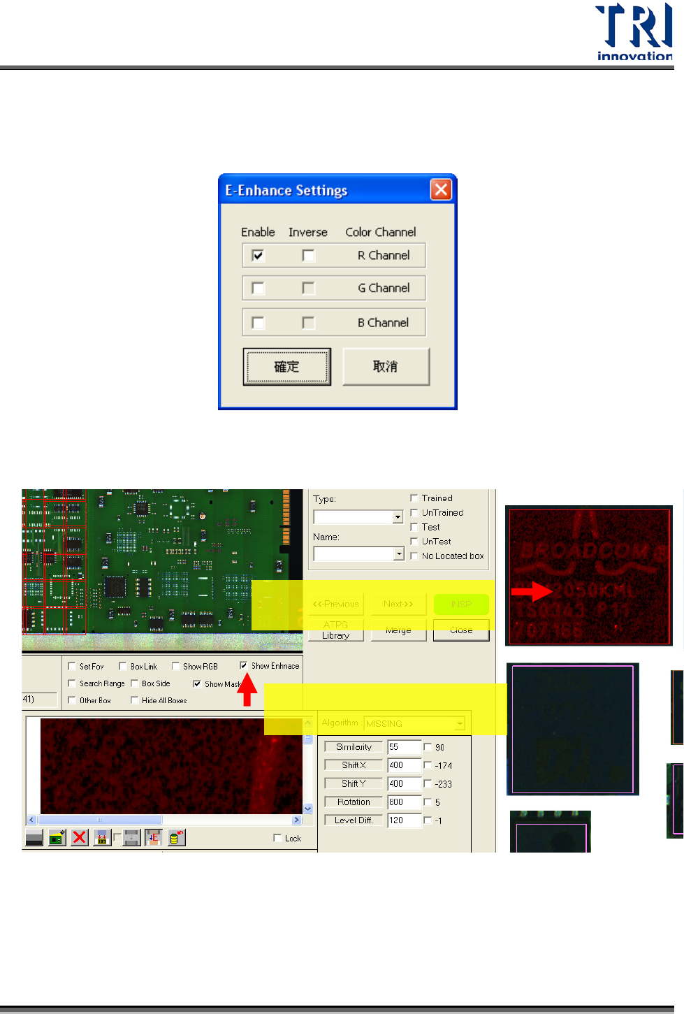 Test Research Inc. TR 7700 S II DL Us er Gui de – Software 525 點選反白選項;如果不一致,建議可以針對不一致的 Color Chan nel 進 行反白處理。 實例: 1. 選擇具有帶料的檢測框,接著點選欲強化的帶料影像後,按下 E- Enhance 按鈕: 1. 選擇具帶料影像之檢測框 2. 點選欲強化之帶料影像 3. 點選 E- E nhanc e 按鈕