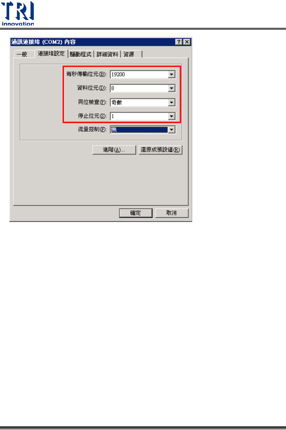 要一致,資料才不會遺失。BaudRate = 19200, Data Bits = 8, Parity = Odd, Stop Bits