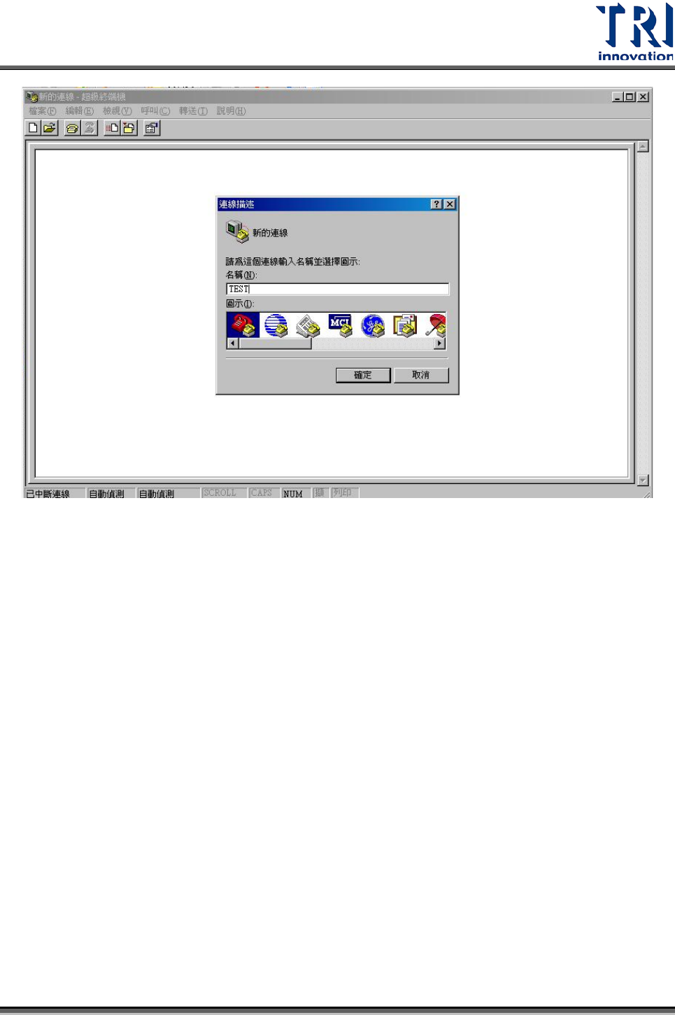 Test Research Inc. TR 7700 S II DL Us er Gui de – Software 579 後段機台是否可以收到訊息 ( 確認訊號格式 OK) 利用超級終端機 (Hy per Term inal) 來確認硬體連線正常和送出的訊息,後段機台可以接 收到,也有回饋。 Step 3. 打開 [ 程式集 ]  [ 附屬應用程式 ]  [ 通訊 ]  [ 超級終端機 ] ,建立連線。