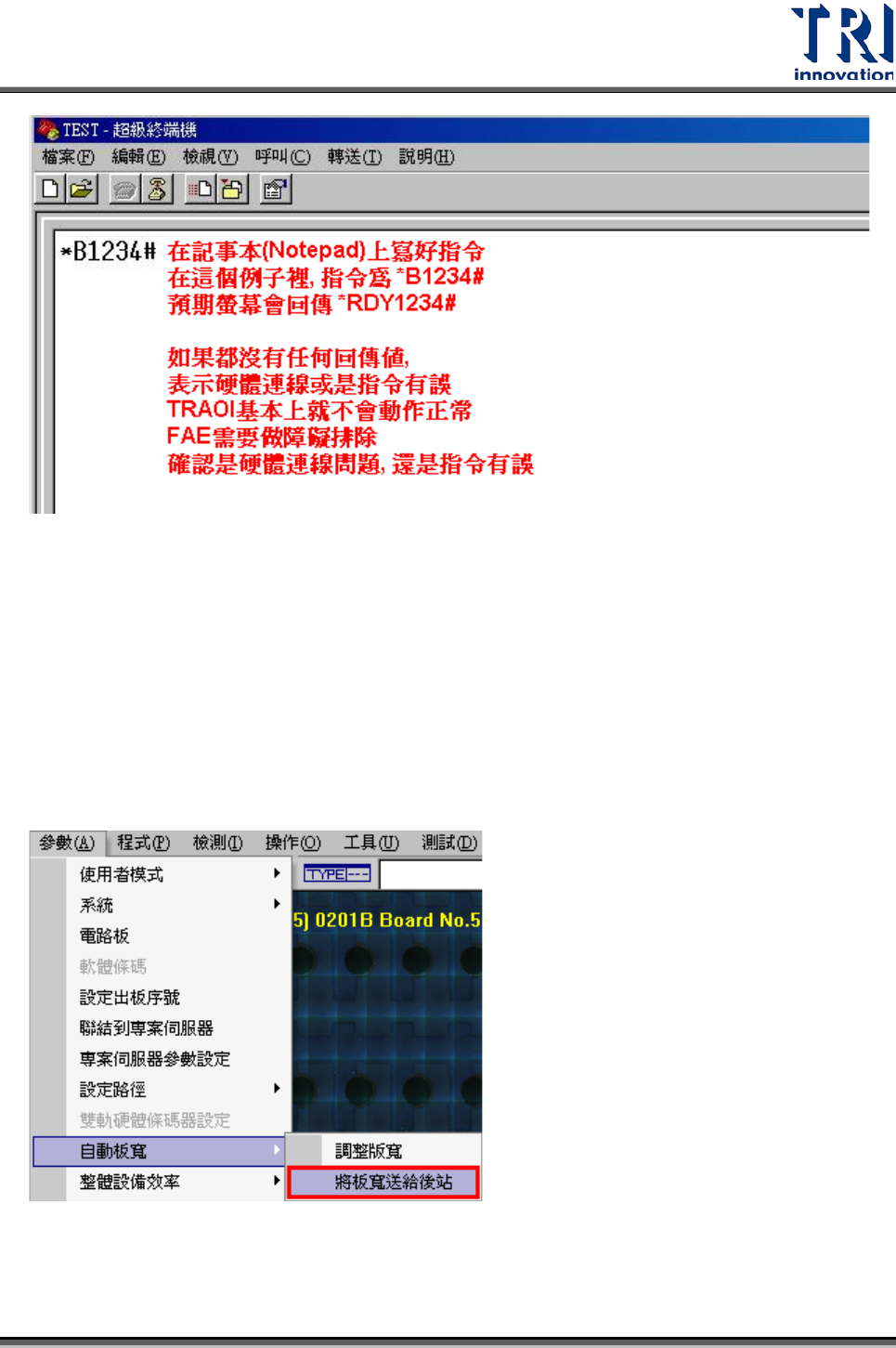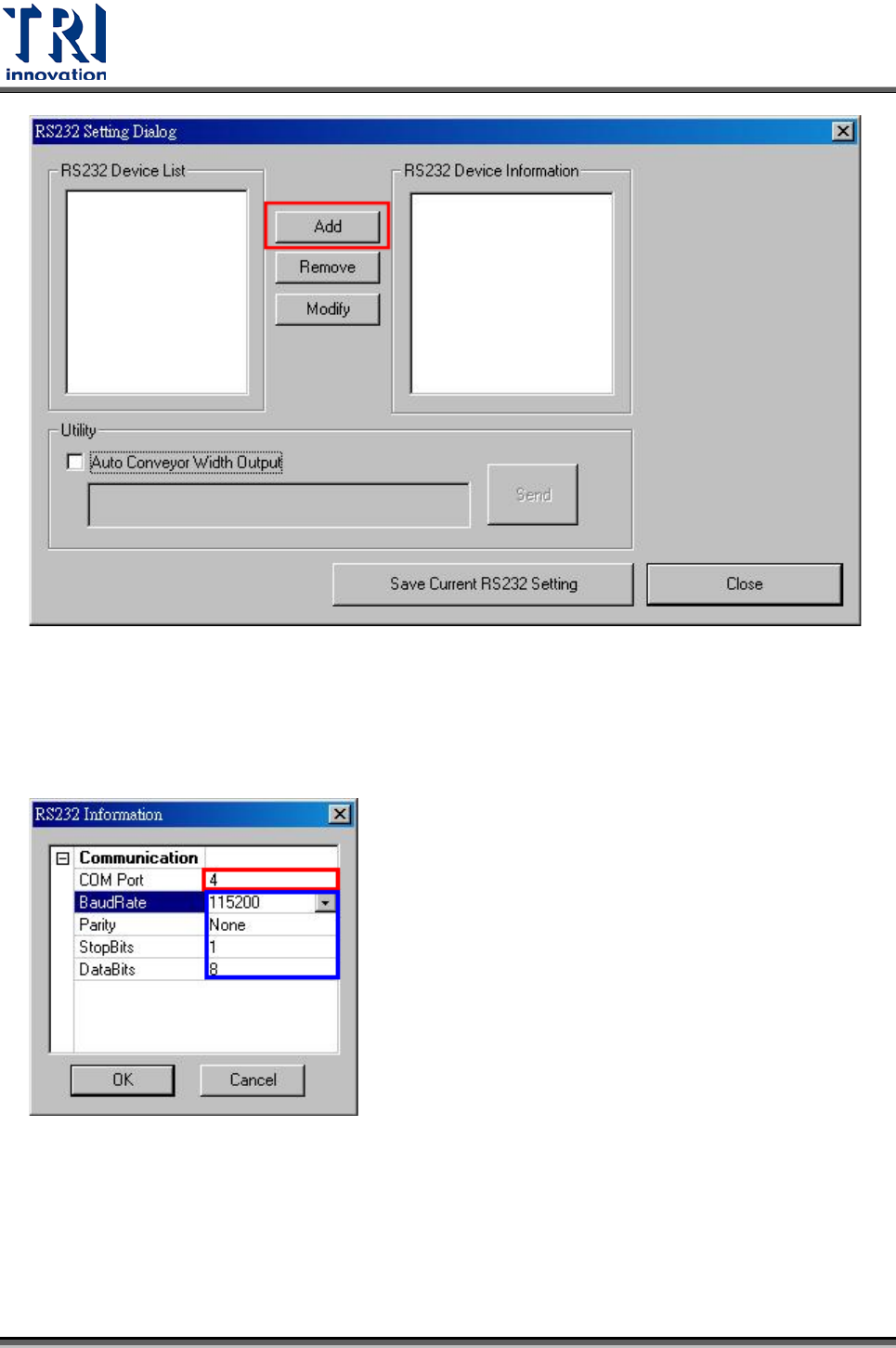 Test Research Inc. TR 7700 S II DL Us er Gui de – Software 585 用滑鼠點擊一下 [COM Port] 部分,就可以手動 鍵入 COM P ort 。用滑鼠點擊一下 [BaudRat e] 、 [Parity] 、 [Stop Bits] 或 [DataBits] 則會有下拉式選單讓使用者選擇。 使用者可以用 [Remove ] 及 [Modify] 選項進行 RS232 De…