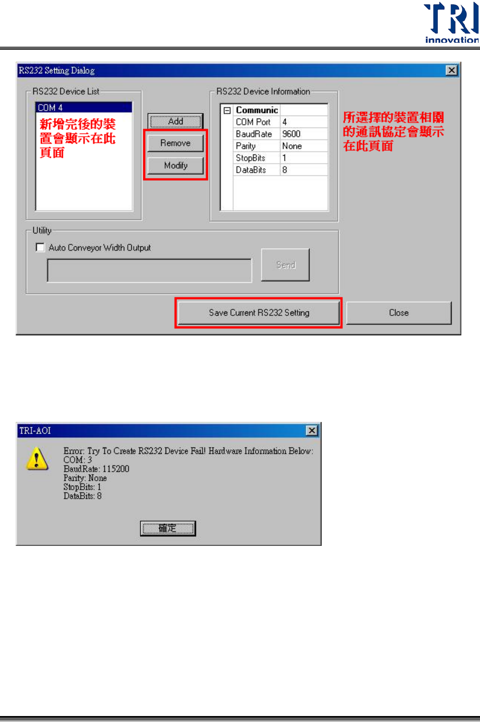 後,按下[Save Current RS232 Setting],讓 AOI 主程式將目前的設定儲存到