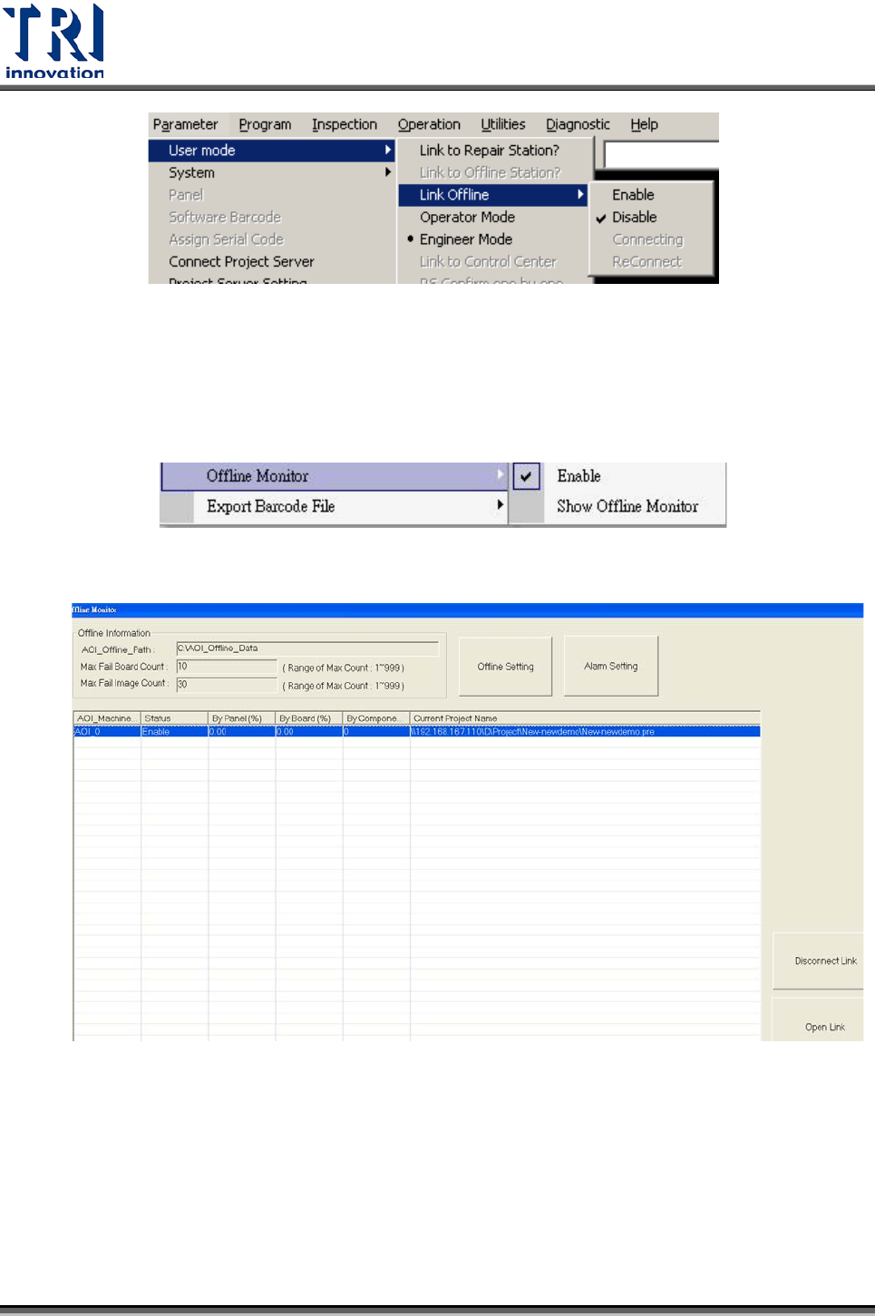 Test Research Inc. TR 7700 S II DL Us er Gui de – Software 595 (2) Offline 機台操作說明 : ( 設定註冊碼 : Offl ine = 1 , NewOffli neFeat ure = 1) 其他操作方式與前版方式一致 a. 到 [Utilitie s] [Offline Monitor] [Enabl e] 打勾 b. 選擇 [Utilitie s] …