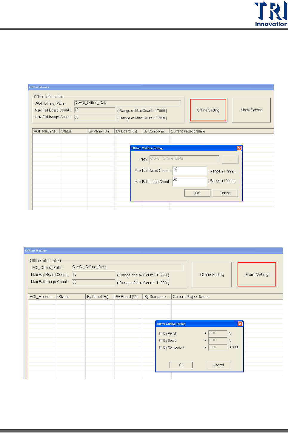 c. 選擇[Offline Setting]:可設定 Max Fail Board Count, Max Fail Image Count