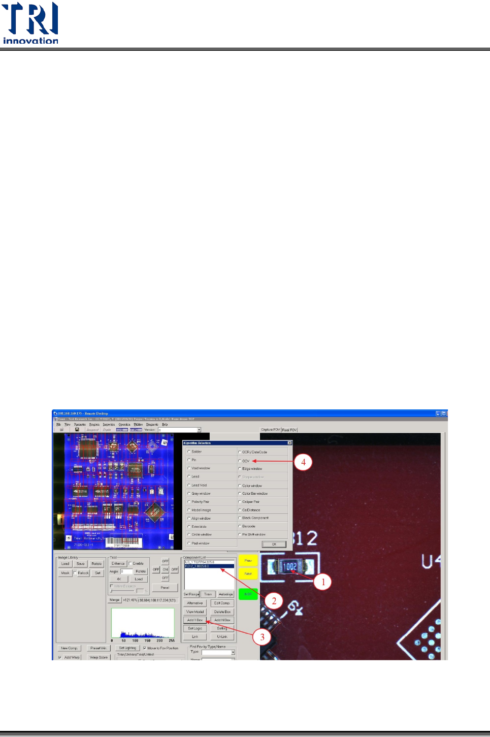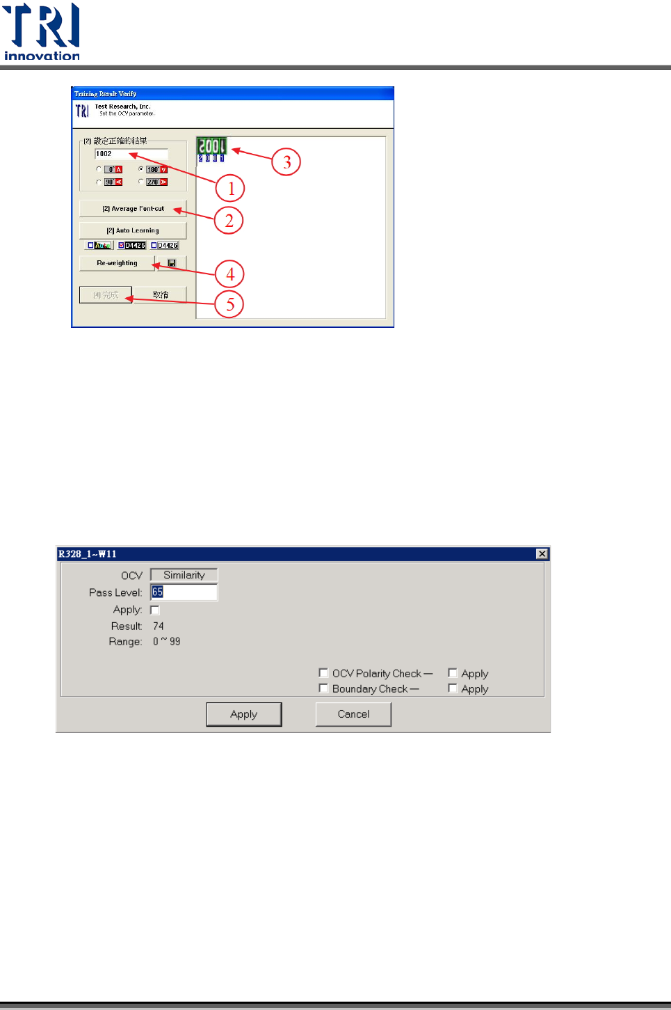 Test Research Inc. 614 TR 7700 S II DL Us er Gui de – Software 2. 如右圖影像過曝會造成 Auto Learni ng 錯誤,另外上下涵蓋文字以外的白色 區域也會影響 Auto Learning 效果 Training Resul t Verify Dialog O CV 訓練說明 : 1. 輸入字串,並選擇角度。 2. 選擇文字切割方法。 3. 右側影像綠框表示切割結…