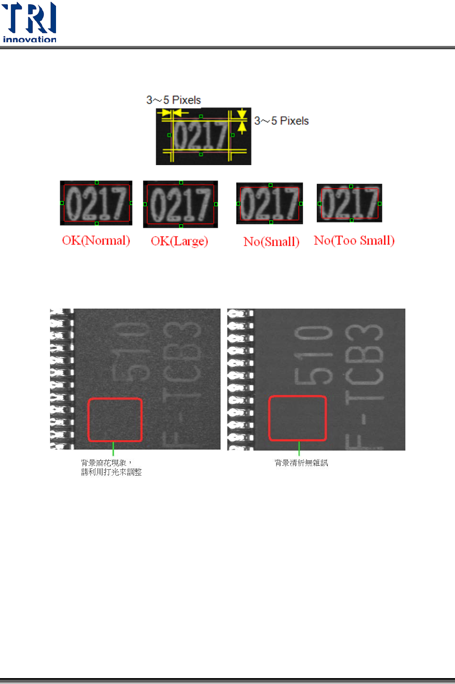 Test Research Inc. 672 TR 7700 S II DL Us er Gui de – Software 5.2 TRI - OCR 限制 1. 一行字串必需有 2 個字元以上,以 Date - Co de 而言為 4 個數字。 每個字元的影像尺寸限制於 20×20 像素 (Pixels) 以上。 在教導時,每行字串需含有數字,影像黑白對比需強烈,可利用打光技巧 ( 環光源 ) 來達成強烈黑白對比;上述在 Run -…