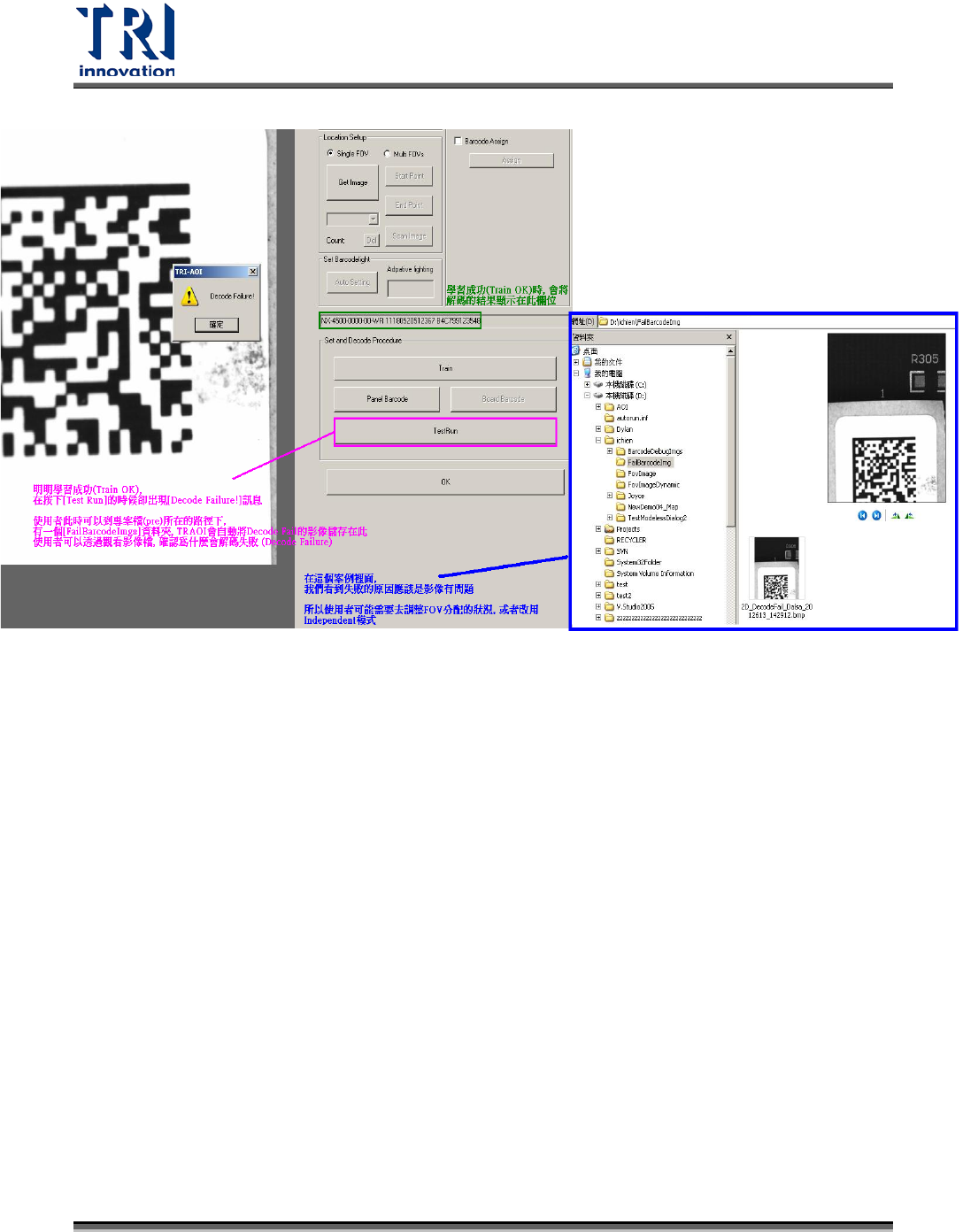 Test Research Inc. 682 TR 7700 S II DL Us er Gui de – Software (b) 檔名為 SpecChar_ ErrCharXX XX.bmp 表示解碼出來的字串, 進行特殊字元檢查 [Enable S pecial C haracter s Filtering ] 的時候失敗。