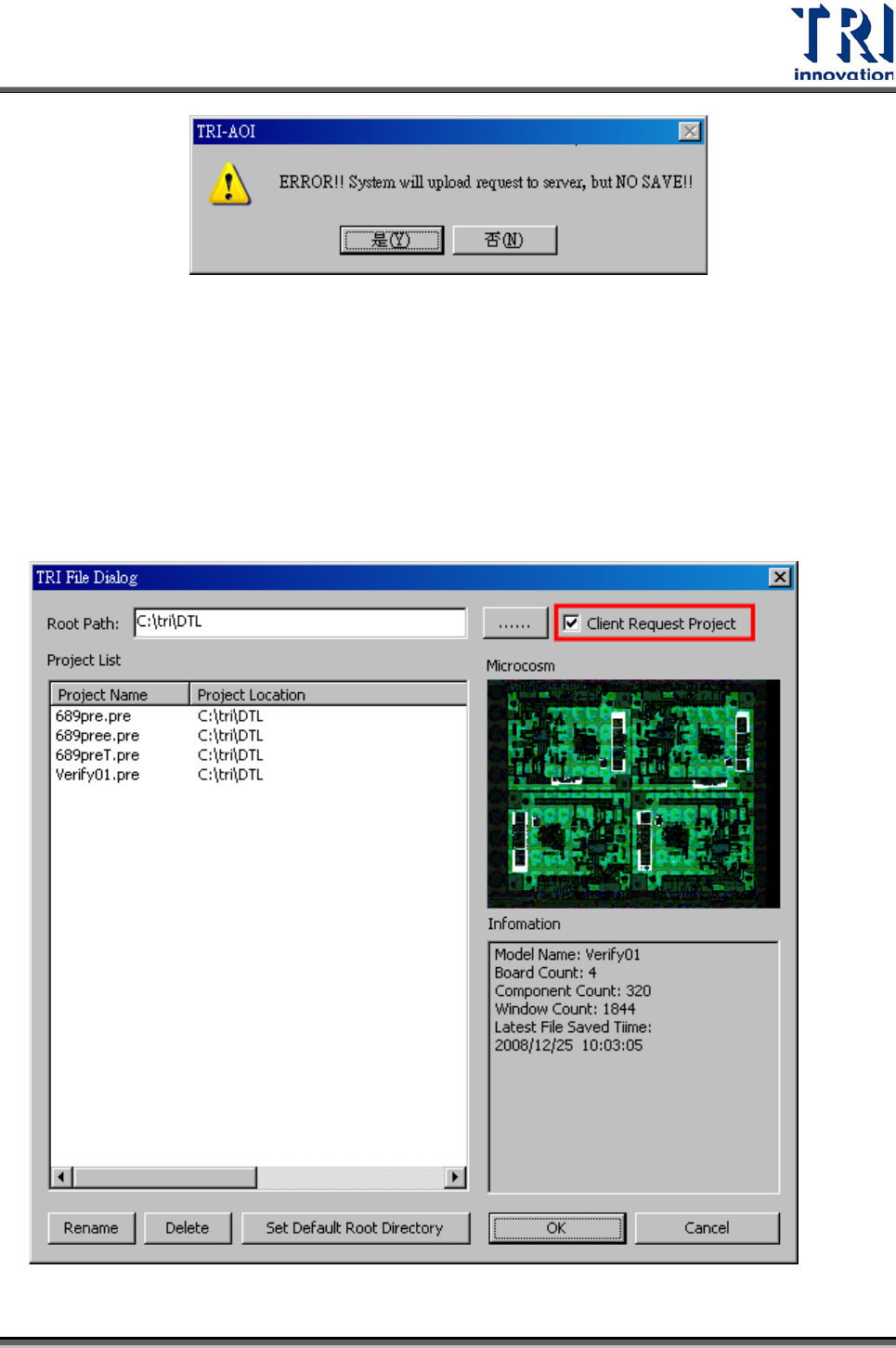 Test Research Inc. 66 TR 7700 S II DL Us er Gui de – Software 2. Server 端 Step 1. 勾選 [ 參數 (Pa ramete r)/ 伺服模式 (Server Mo de)] 。 Step 2. 開啟檔案。勾選 [Client Reques t Project ] ,可以顯示出在 Client 端有修 改的 Project 。 Step 3. 開啟後會出現修改的…
