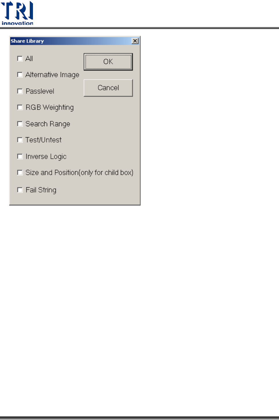 Test Research Inc. TR 7700 S II DL Us er Gui de – Software 71 1. Alternati ve Imag e 新增代料影像:當使用者在 Project 新增代料影像時,軟體會出現一個視窗,詢問是 否要將本操作設定到 Library 。若勾選,則代料影像除了存入 Projec t 之外,也會存入 Library ,即可被其它 Project 共享,此代料影像即為 Global 代…