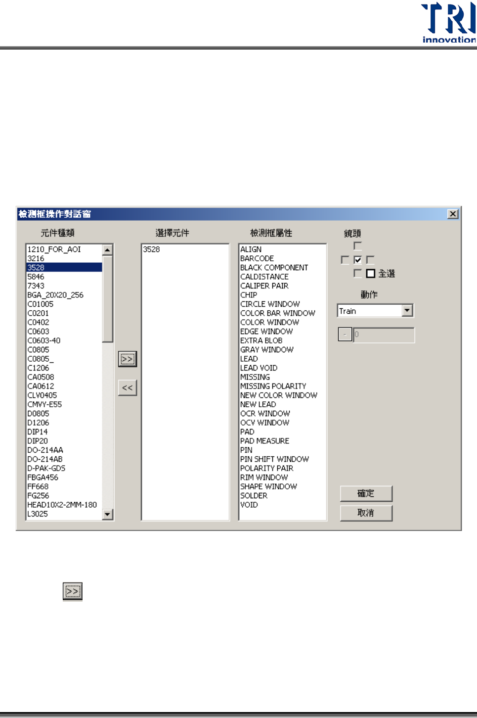 Test Research Inc. TR 7700 S II DL Us er Gui de – Software 223 1. Change Passl evel : 改變比對條件的分數。當選擇此選項時,下方工具列會亮起, 點選 鈕可以切換正負號,正號表示將原始的參數加上後面輸入的數值,負號表 示將原始的參數減掉後面輸入的數值,假設原始的參數為 60 ,且在此處設定為 ,則修改後的參數會變成 65 。若欄位中輸入的數字為 0 ,則表…