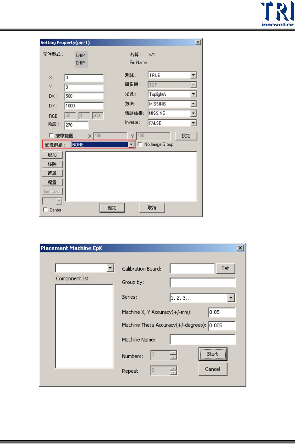 Test Research Inc. TR 7700 S II DL Us er Gui de – Software 2 73 (4) 填滿所有空格資料 ( 註 1 , 2 , 3) 。 (5) 按下 [Start ] 。 註 1: Numbers 欄位為 Group series 的數目,會自動更新,可依使用者需求微 調。如果手動輸入值為 3 ,表示 DOT 板只打最下面 3 行元件;如果手動輸入 值為 6 ,表示 DOT 板只打最下…